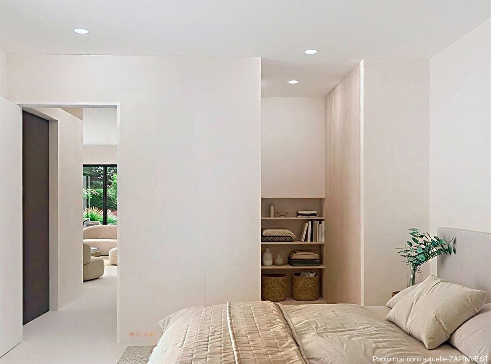 Au rez-de-chaussée, un grand salon-salle à manger avec cuisine ouverte, offre un aspect lumineux grâce à son design contemporain et donne directement sur le jardin avec une place parking privée sur la parcelle.