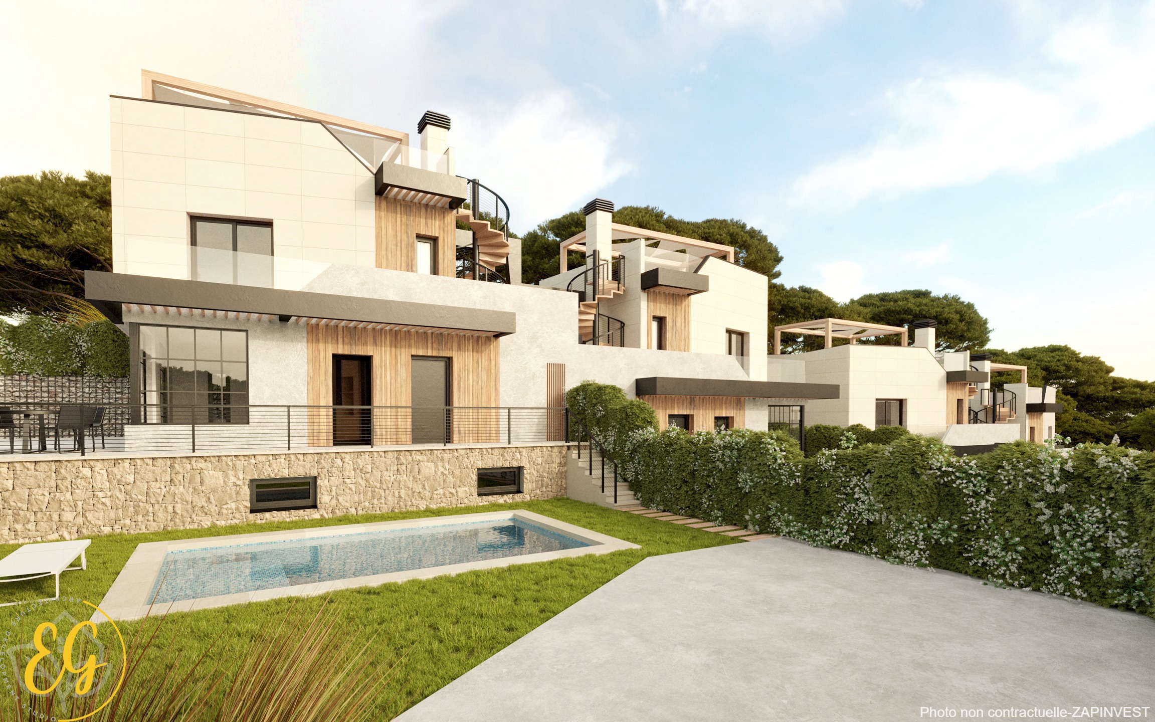La villa est construite sur une parcelle de 345m2 òu ce qui prévaut est le confort et la qualité vitale de ses espaces ;