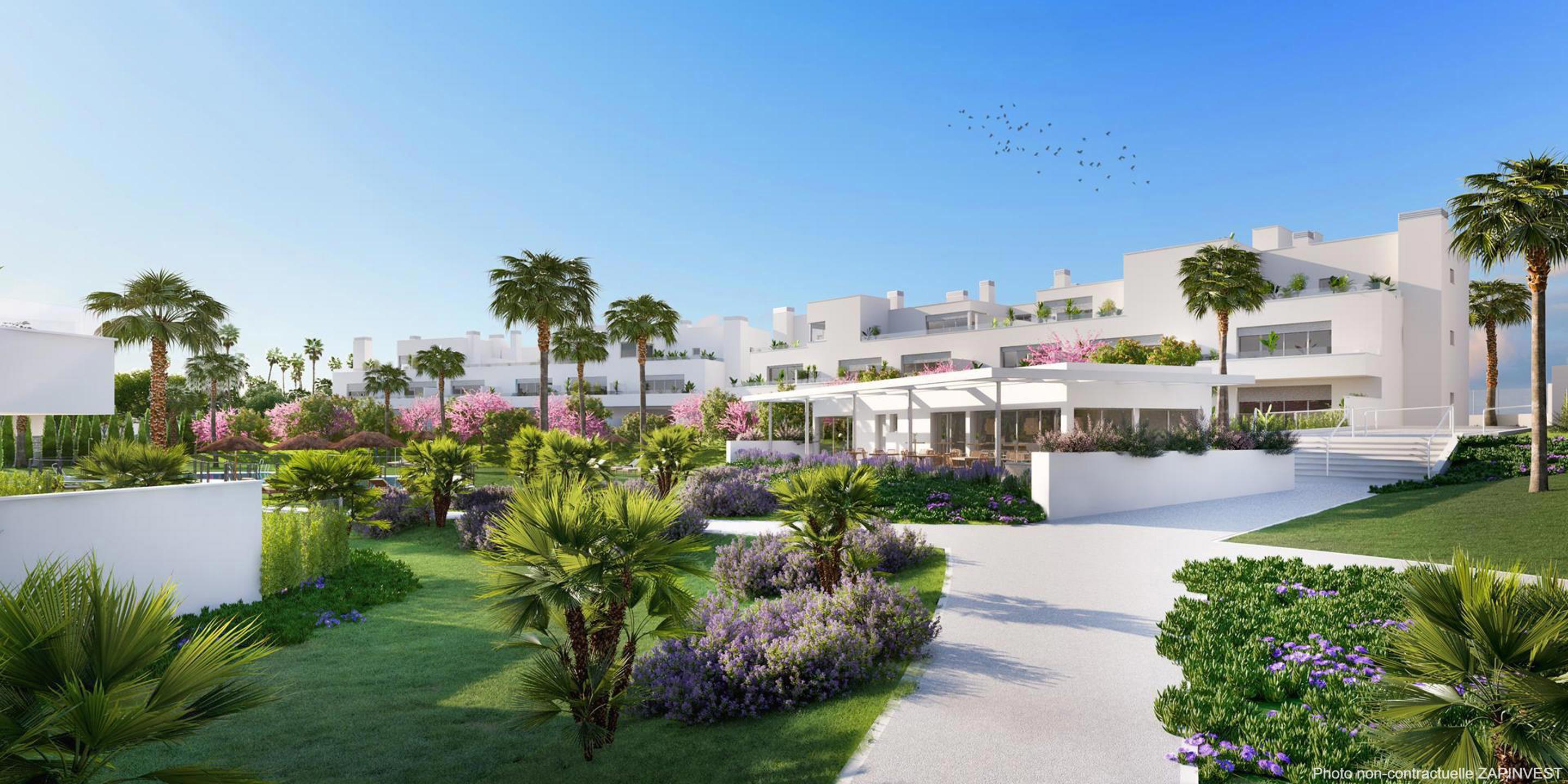 La verdure luxuriante des jardins est une des caractéristiques de ce projet, un oasis privé à quelques centaines de mètres de la mer et avec, au coeur de la communauté, une grand piscine commune avec une zone de détente spacieuse.