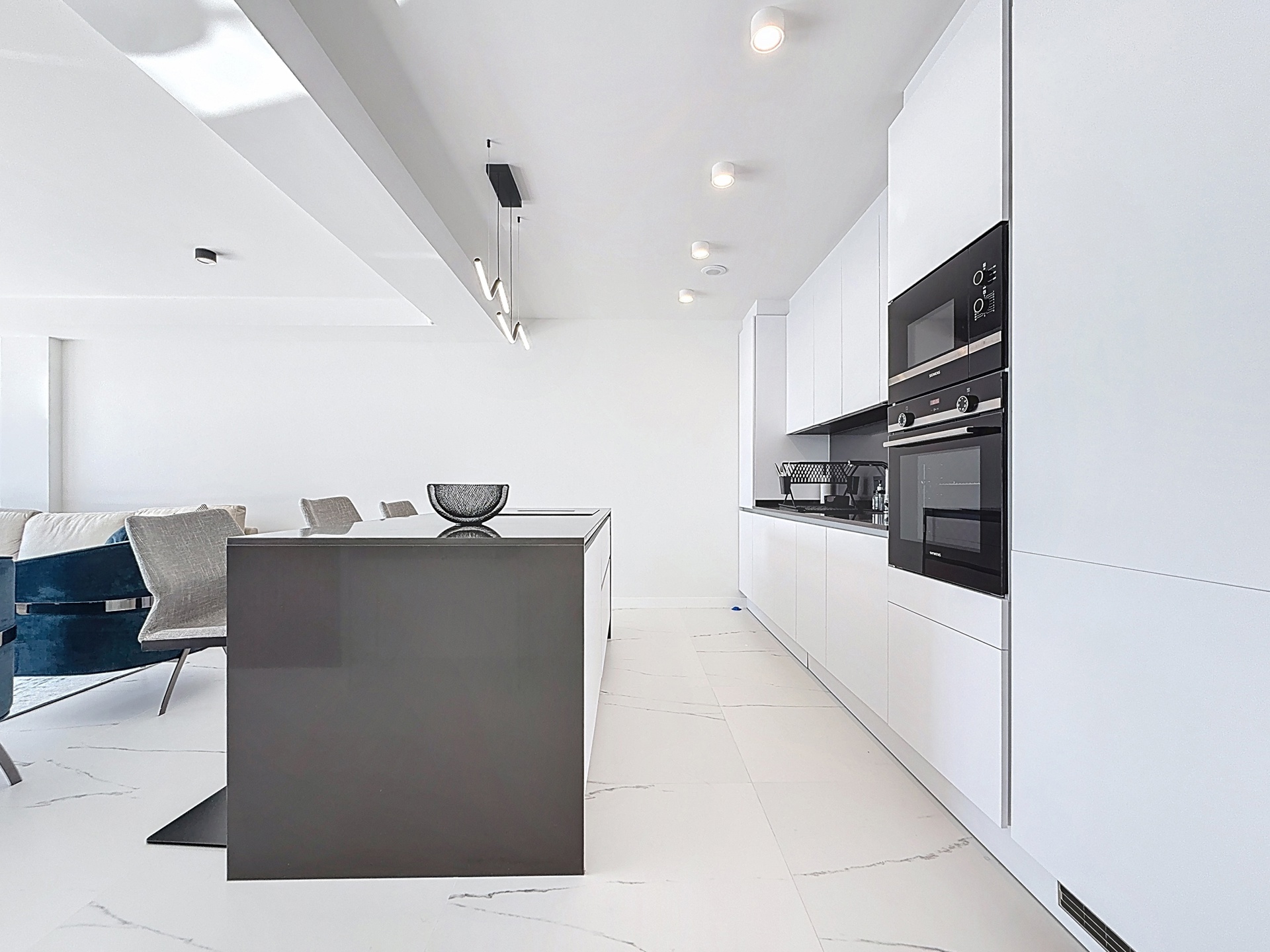 L’espace de vie a été pensé pour une vie dedans-dehors fluide : une cuisine ouverte entièrement équipée, avec îlot central, s’ouvre naturellement sur la salle à manger et le salon. L’ensemble se prolonge sur une magnifique terrasse de plus de 40 m², véritable pièce à vivre extérieure, idéale pour les repas, la détente et les soirées face à la Méditerranée.