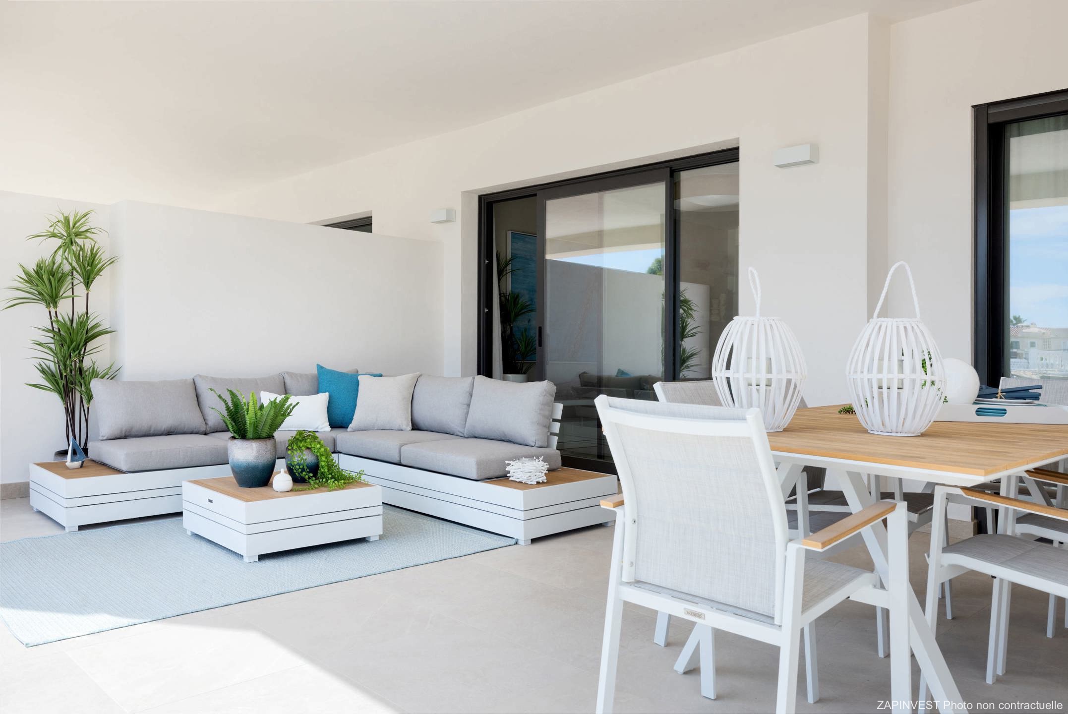Il bénéficie d'une cuisine entièrement équipée avec des électroménagers de qualité ouverte sur un salon salle à manger et donnant accès à une magnifique terrasse de plus de 100m2. Les salles de bains ont été décorées et meublées dans des tons neutres et relaxants tout en offrant la simplicité du luxe épuré.