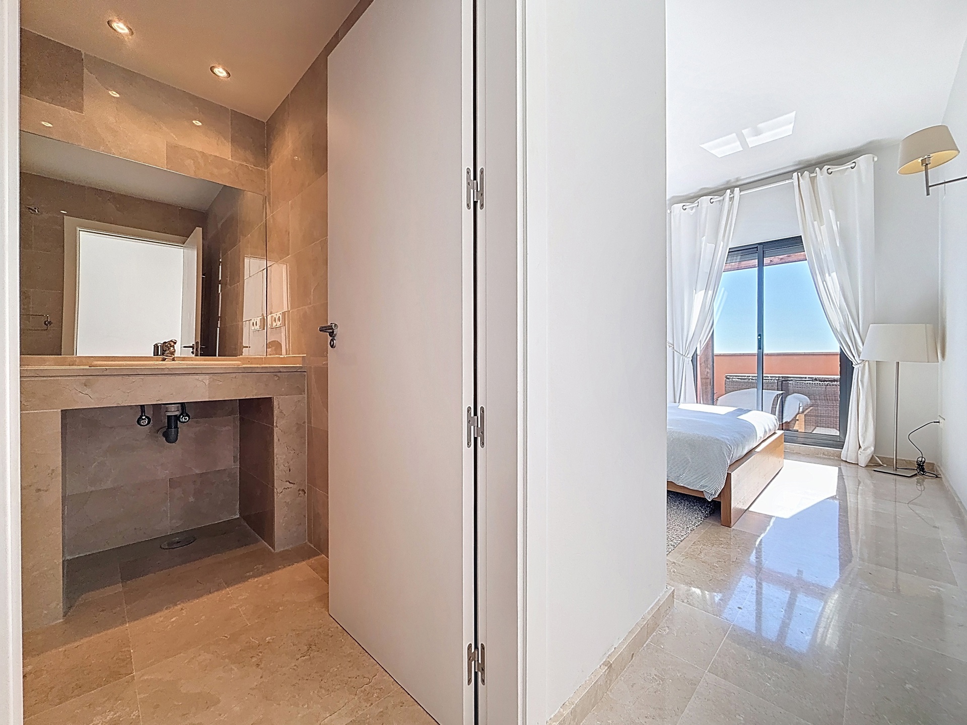 Superbe penthouse de 115 m² complété par une terrasse de 20 m² exposée plein Sud, offrant de très belles vues dégagées sur la nature environnante, avec la mer et, selon la visibilité, les côtes africaines en ligne d’horizon.