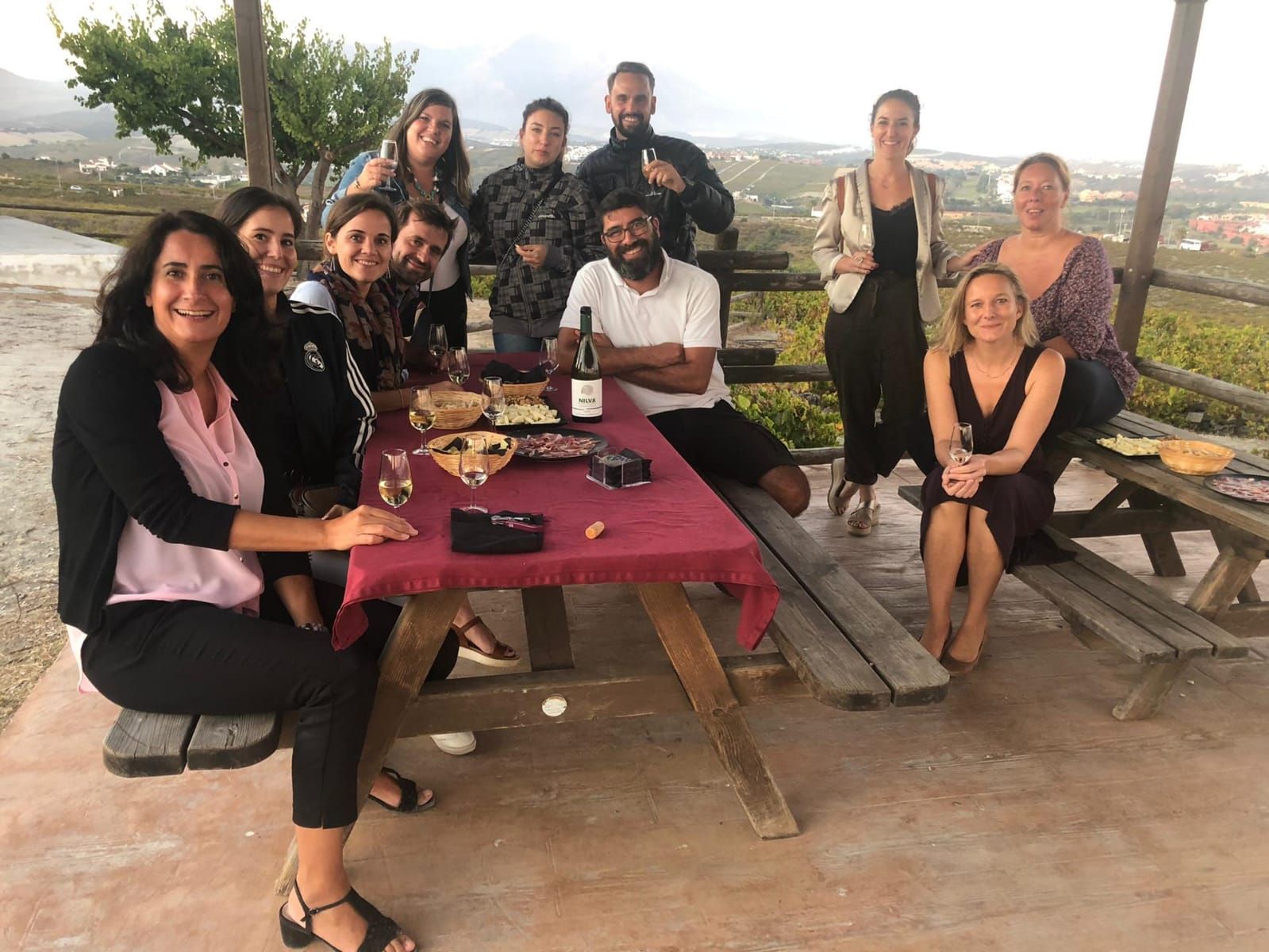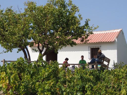 La visite se fait de plus en plus concrète… c’est donc le moment de rejoindre le domaine viticole pour la tant attendue dégustation. L’endroit est fabuleux ! Depuis la plantation, nous avons une vue dégagée sur la côte et toute la région. Sous la pergola, au sommet de la vigne nous attendent quelques tapas, les choses sérieuses peuvent commencer ! Nous dégustons les 3 sortes de vins produits au domaine, à base de raisin Moscatel. Le blanc sec, à la robe claire (le seul qui est commercialisé), un demi-sec (déjà bien sucré, on sent que le soleil à bien fait son ouvrage) à la robe dorée et enfin, un vin sucré, de type cherry de Malaga, à la magnifique robe rousse qui ravit nos papilles.