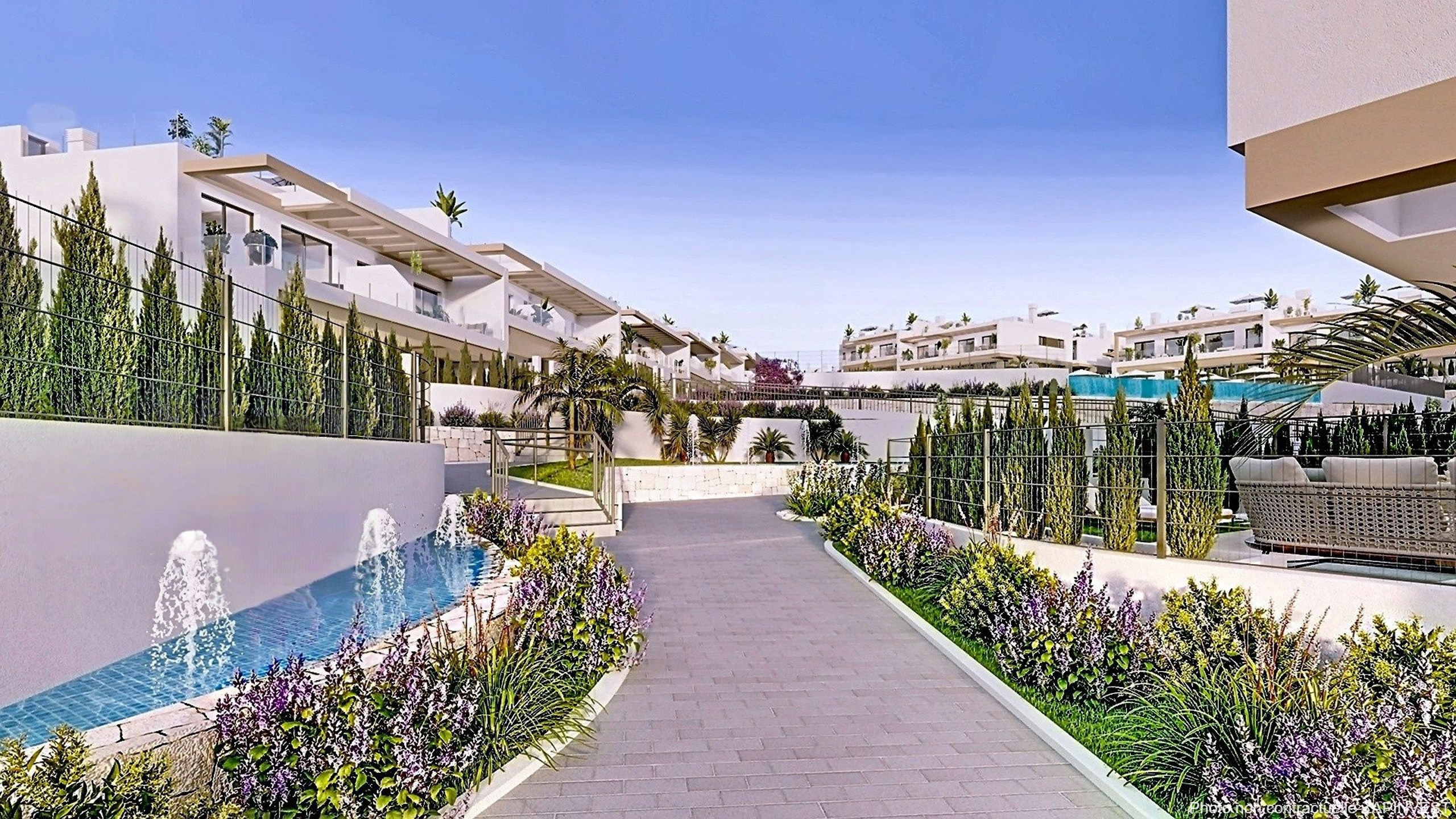 Vous pourrez profiter depuis votre solarium des magnifiques vues sur la lagune salée de Torrevieja ou encore depuis les 17m² de la terrasse de votre salon donnant sur les jardins et les 2 piscines de chloration de sel de l’urbanisation. Une des piscines est à dégagement ou Infinity de et l’autre est chauffée avec 2 jacuzzis chauffés également d'une capacité de 6 à 7 personnes ainsi qu’une piscine pour enfants avec gazon artificiel.