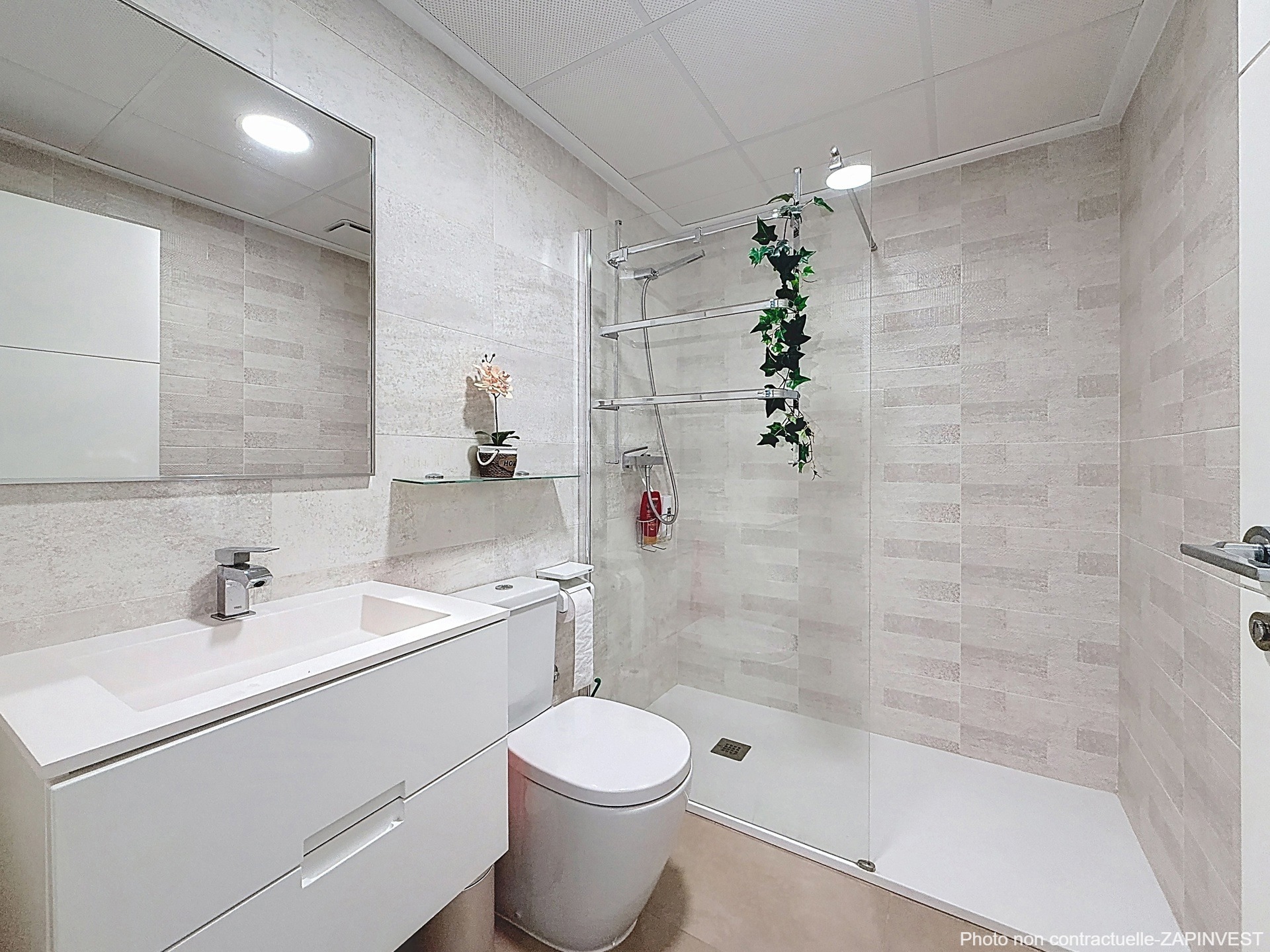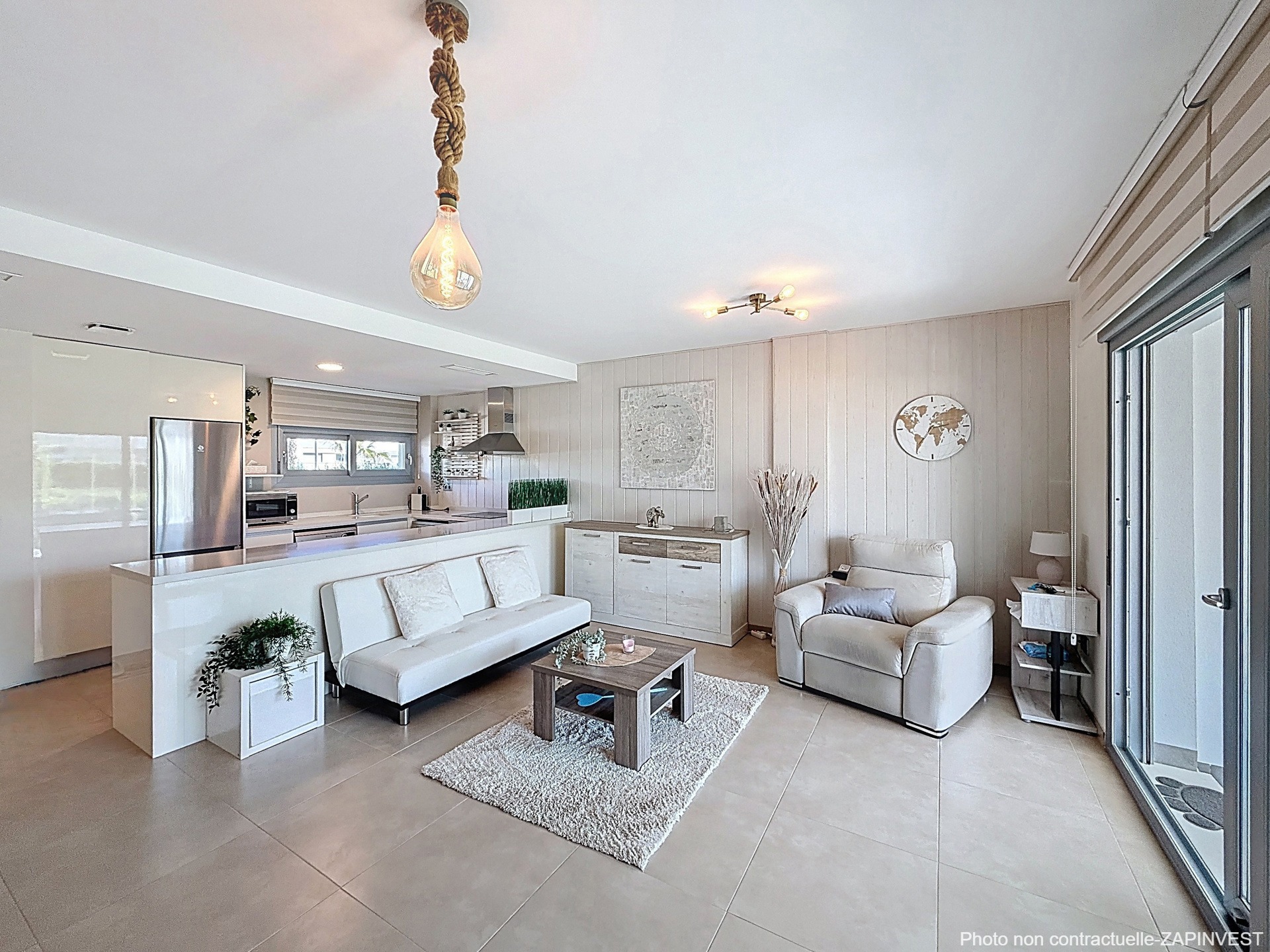 L’appartement, avec un salon salle à manger spacieux et lumineux et une magnifique cuisine américaine donnant sur une terrasse couverte et vitrée de 17 m² et le jardin permettant l’accès direct à la piscine communautaire et ses jardins.