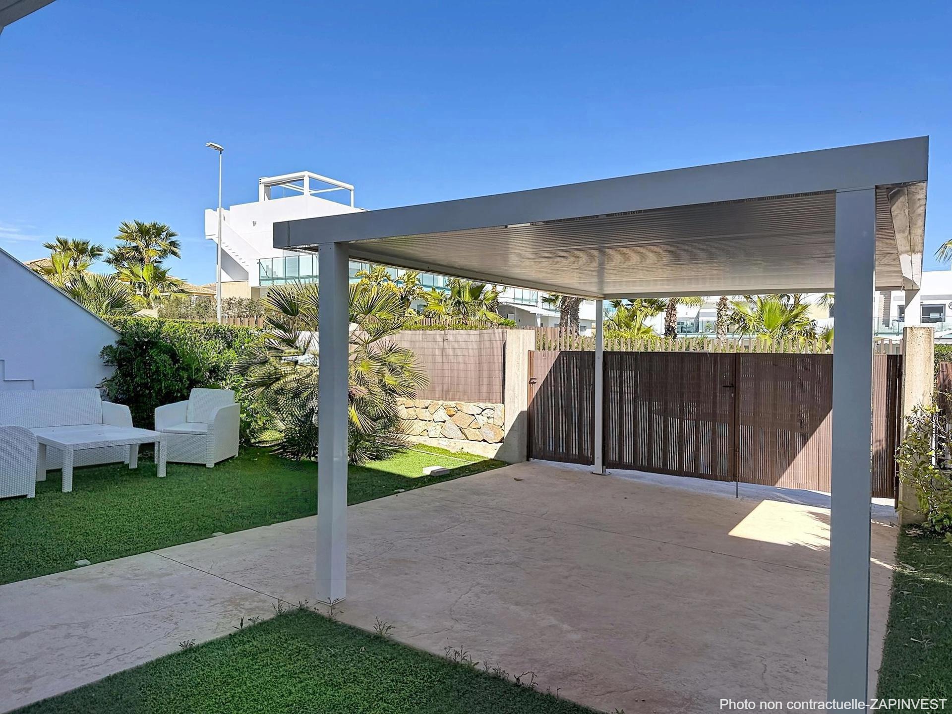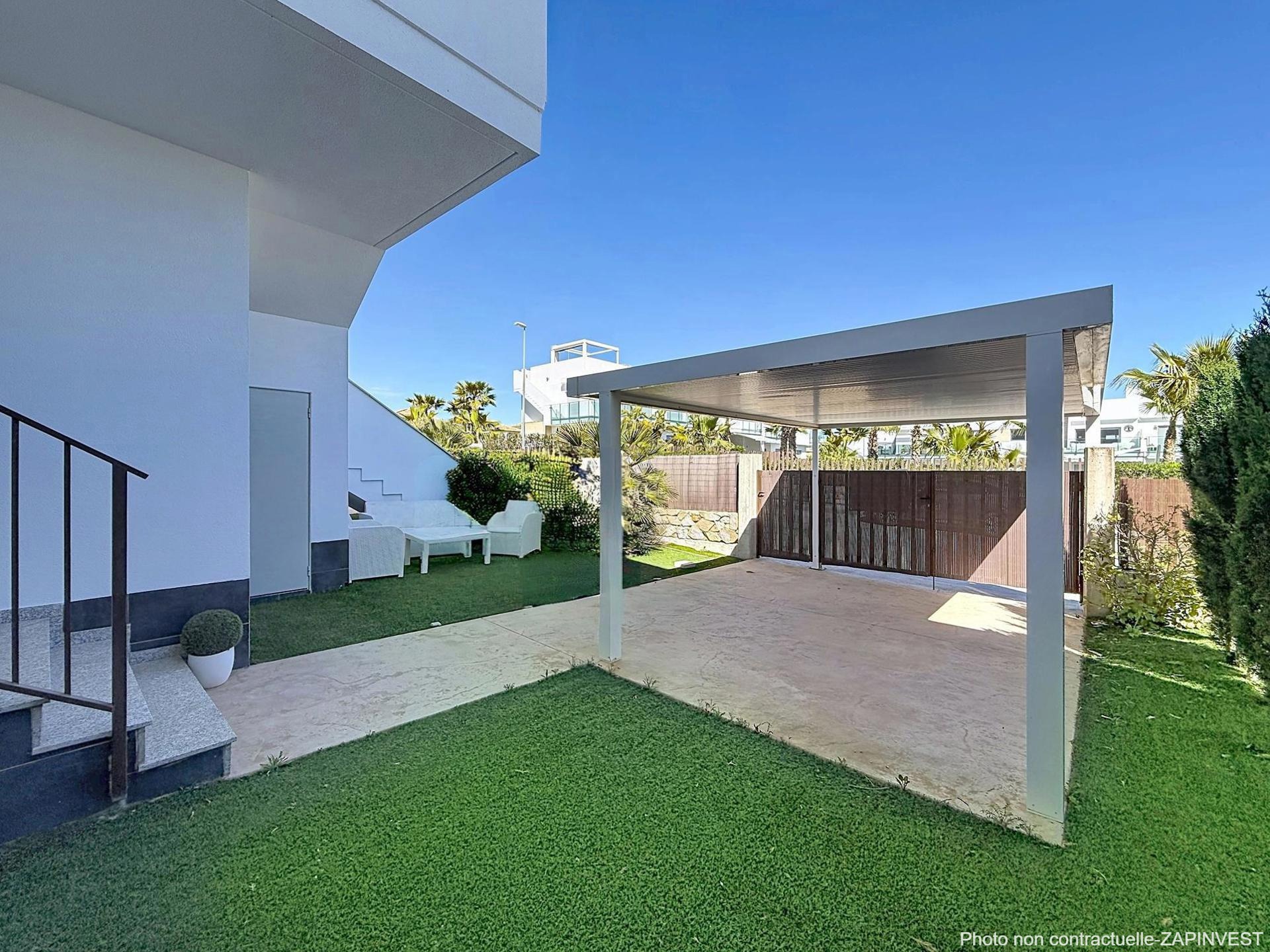 Tout d’abord, un grand jardin avec emplacement couvert pour la voiture, une cave ainsi qu’une zone de détente avec gazon artificiel et plantes.