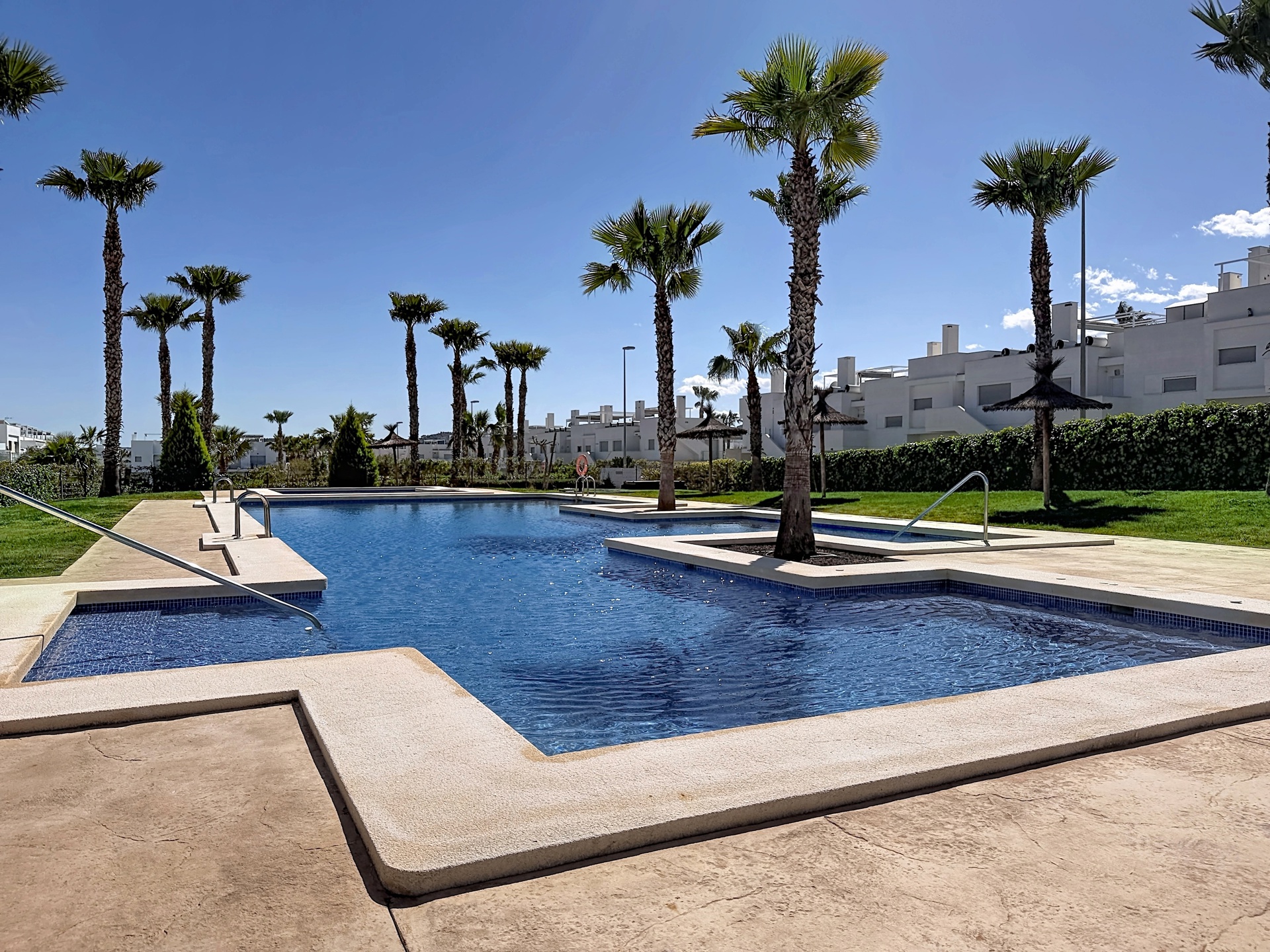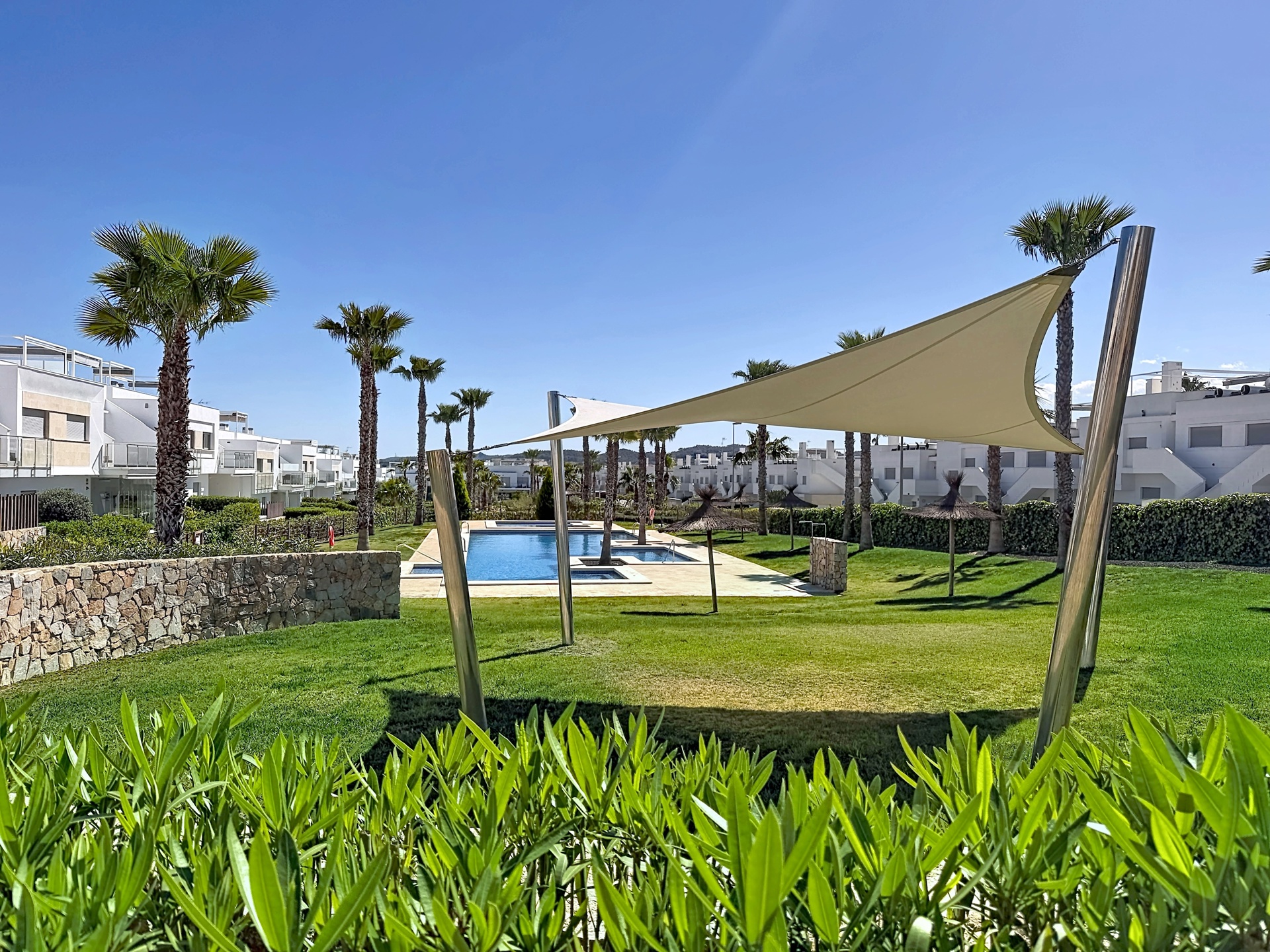 Une des principales particularités de ce complexe c’est l’espace de ses zones communes. Celles-ci sont particulièrement grandes, vertes et aérées, composées de très grands jardins avec plan d'eau, de chemins de promenades, d'équipements extérieurs et d'une splendide piscine commune entourée de pelouse et de parasols.