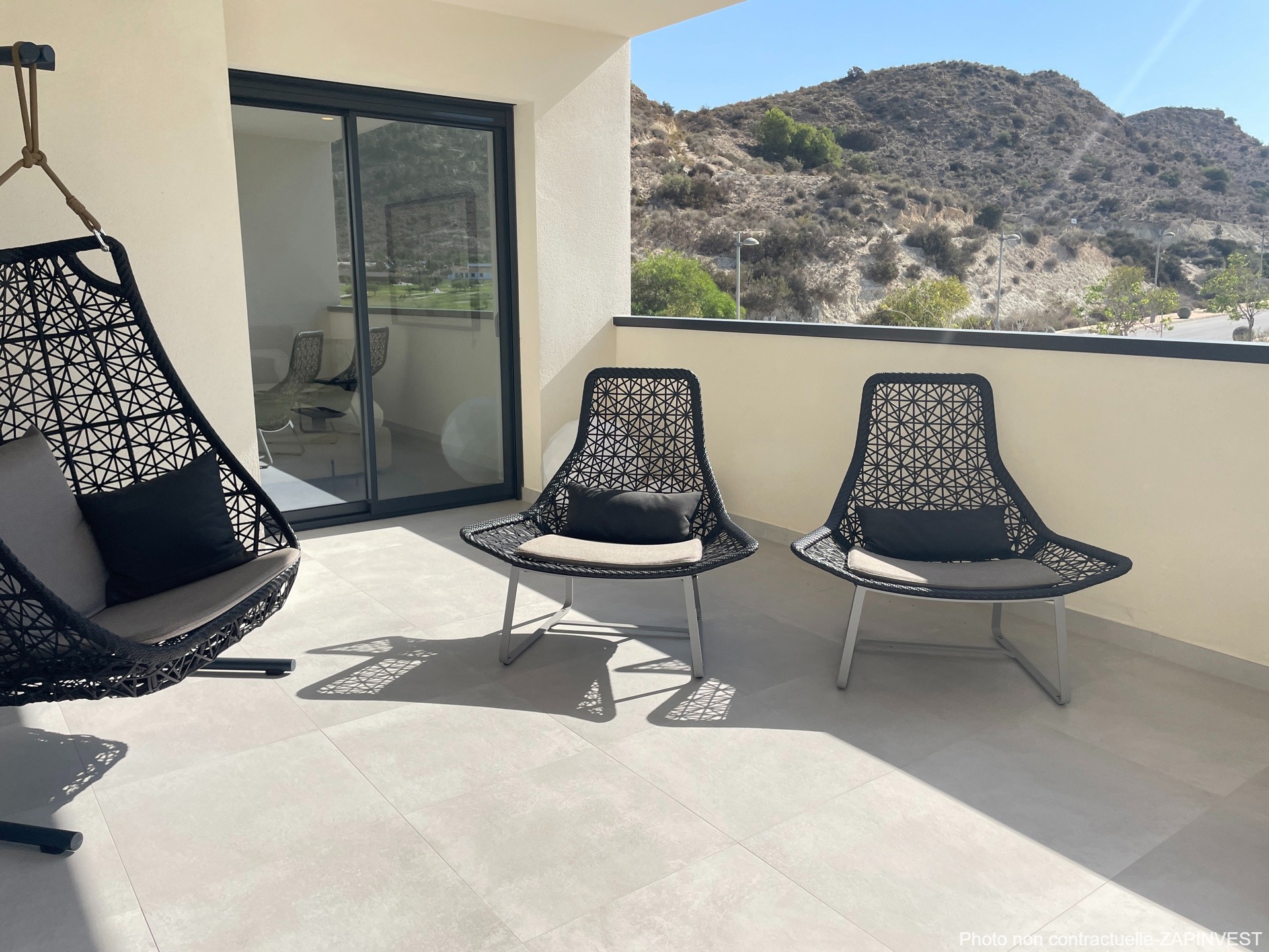 L'appartement dispose de grandes baies vitréés protégées, donnant sur la terrasse semi-couverte, qui laissent filtrer la lumière et appportent à l'espace de vie une lumière douce et naturelle.