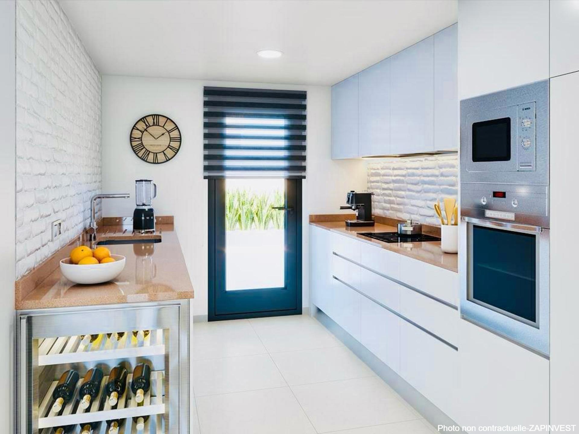 L’espace de vie comprend une cuisine ouverte entièrement équipée, donnant sur un vaste salon-salle à manger. Grâce à une large baie vitrée, vous accédez directement à la terrasse, au jardin aménagé et à la piscine privée de 6 x 2,5 m., incluse dans le prix