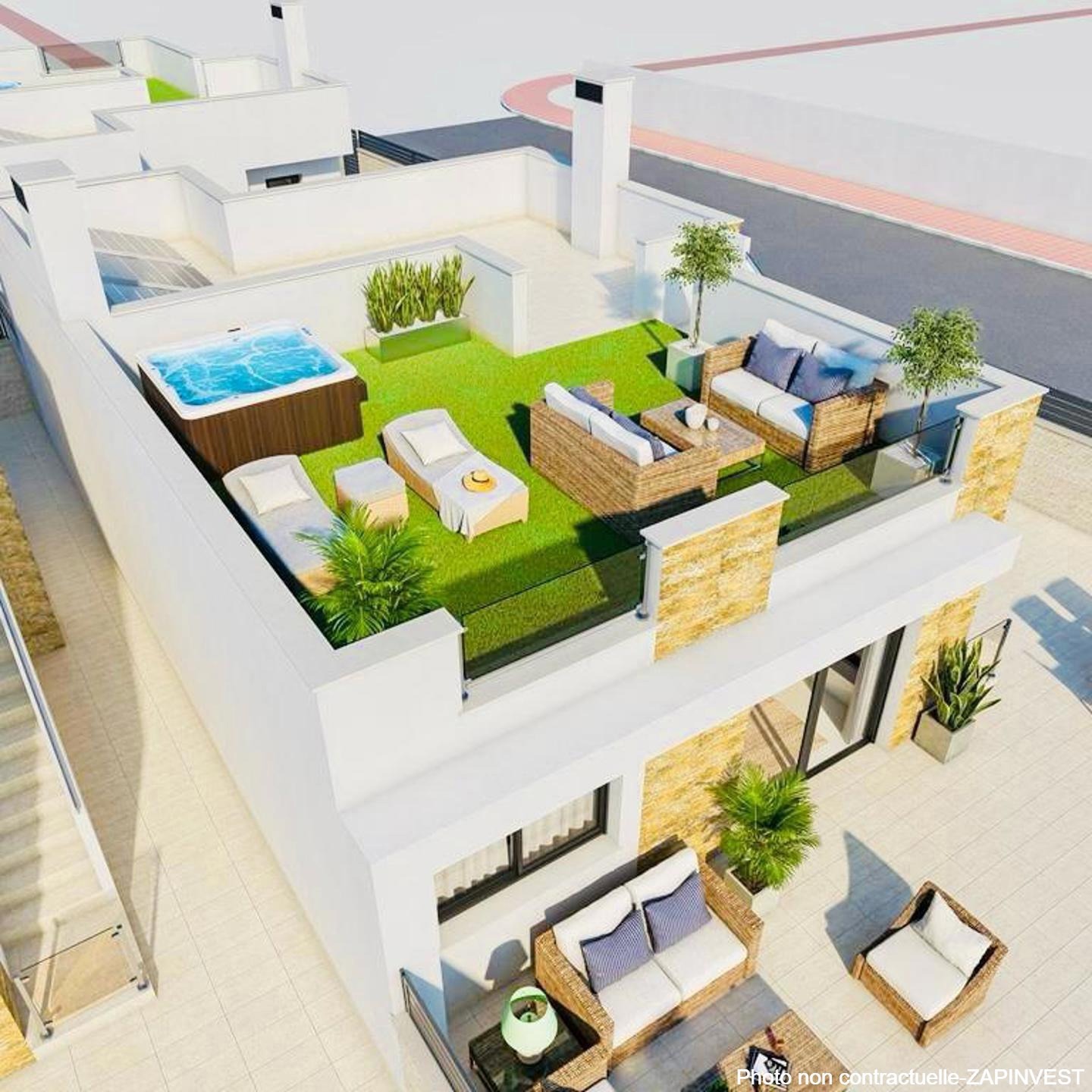 Le jardin est entièrement clos, parfait pour profiter en toute intimité des belles journées ensoleillées. Également inclus dans le prix, chaque villa dispose d’un grand solarium (terrasse sur le toit) de plus de 90 m² — idéal pour bronzer, recevoir ou simplement admirer les alentours.