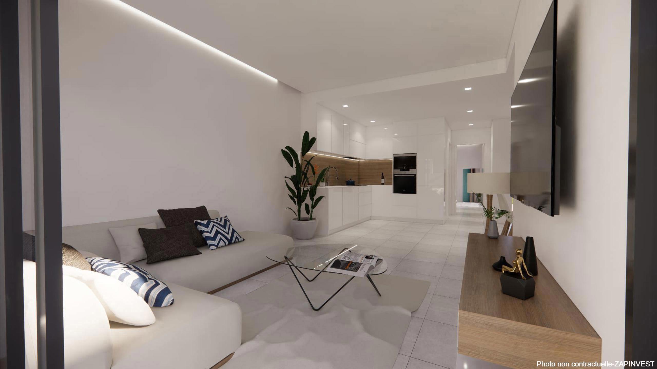 Très grand et lumineux salon-living donnant d'un côté sur la cuisine ouverte et de l'autre sur l'espace extérieur de la piscine.
