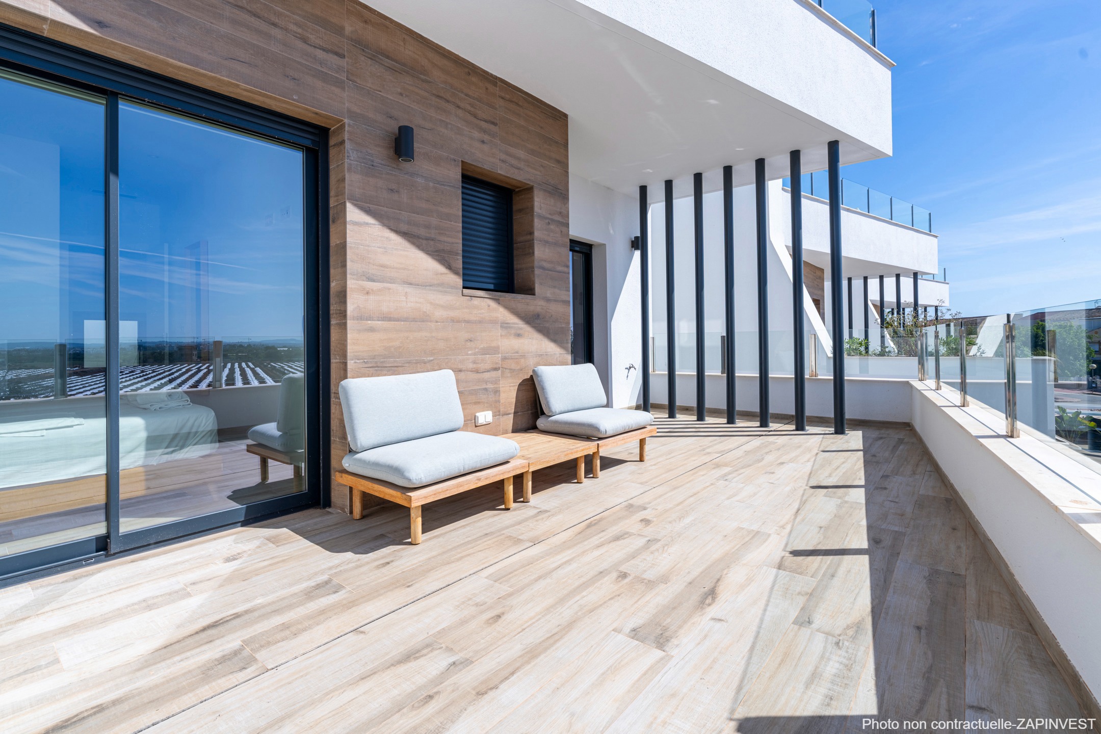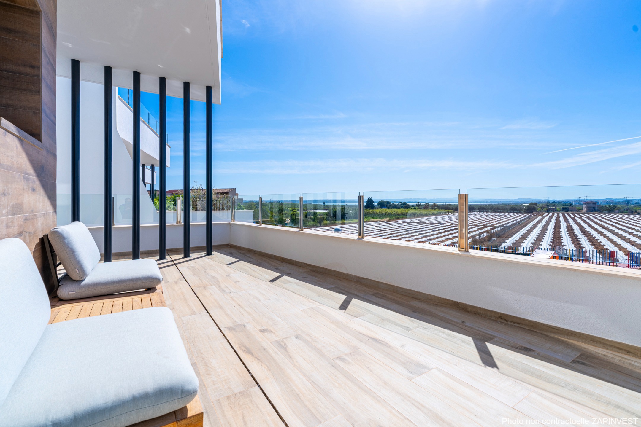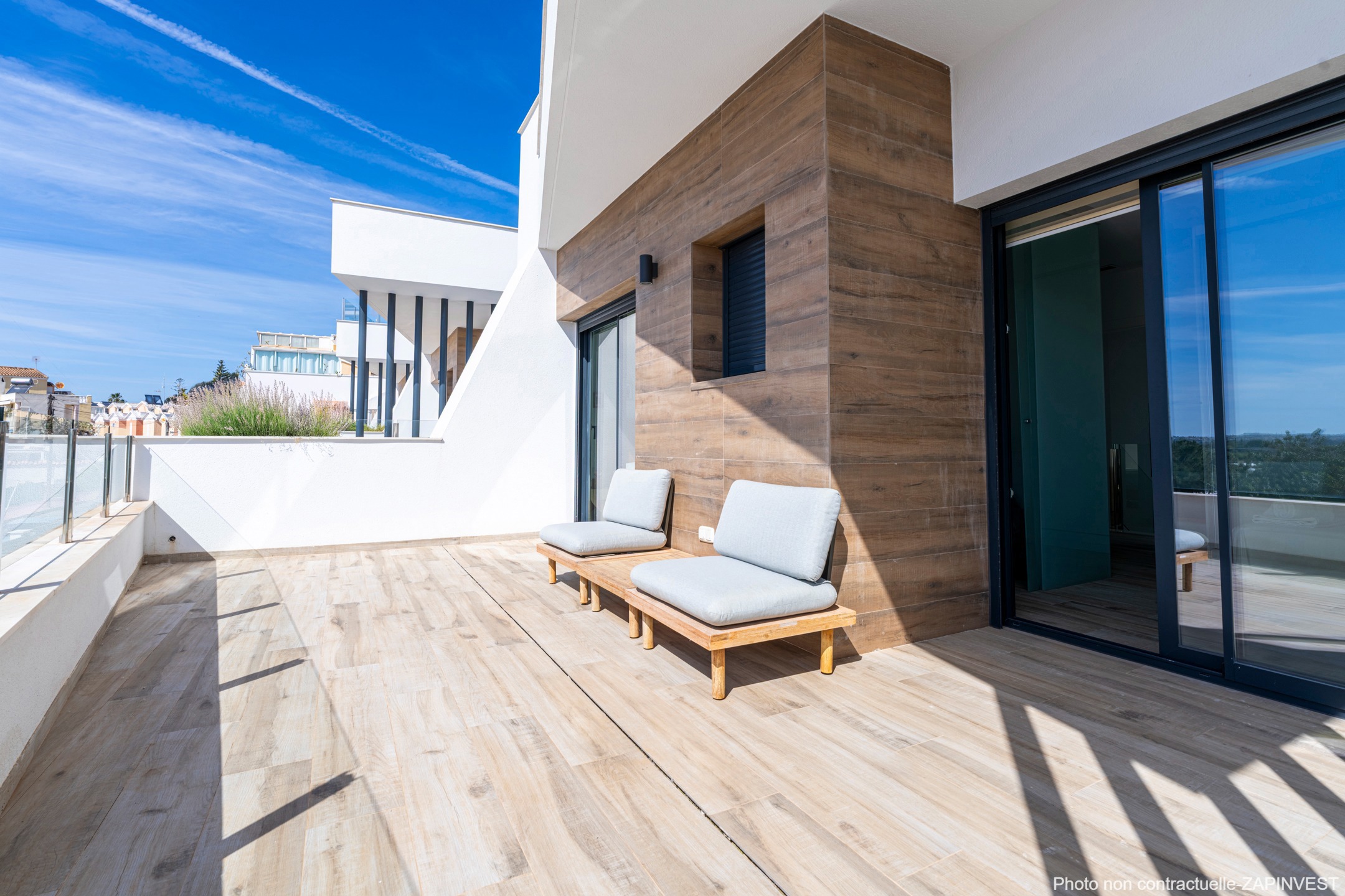 Depuis le premier étage, vous pourrez accéder à la belle terrasse-solarium de 36 m² et profiter des vues sur la mer.