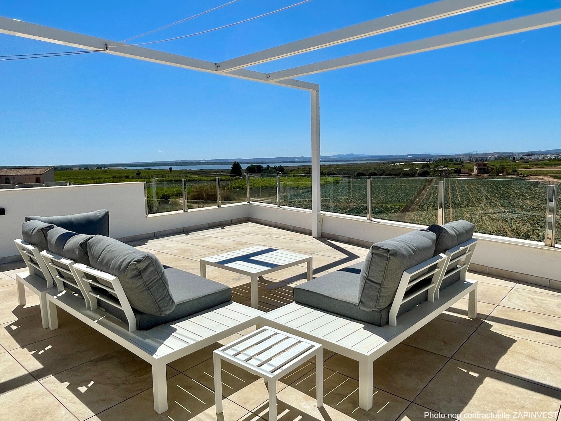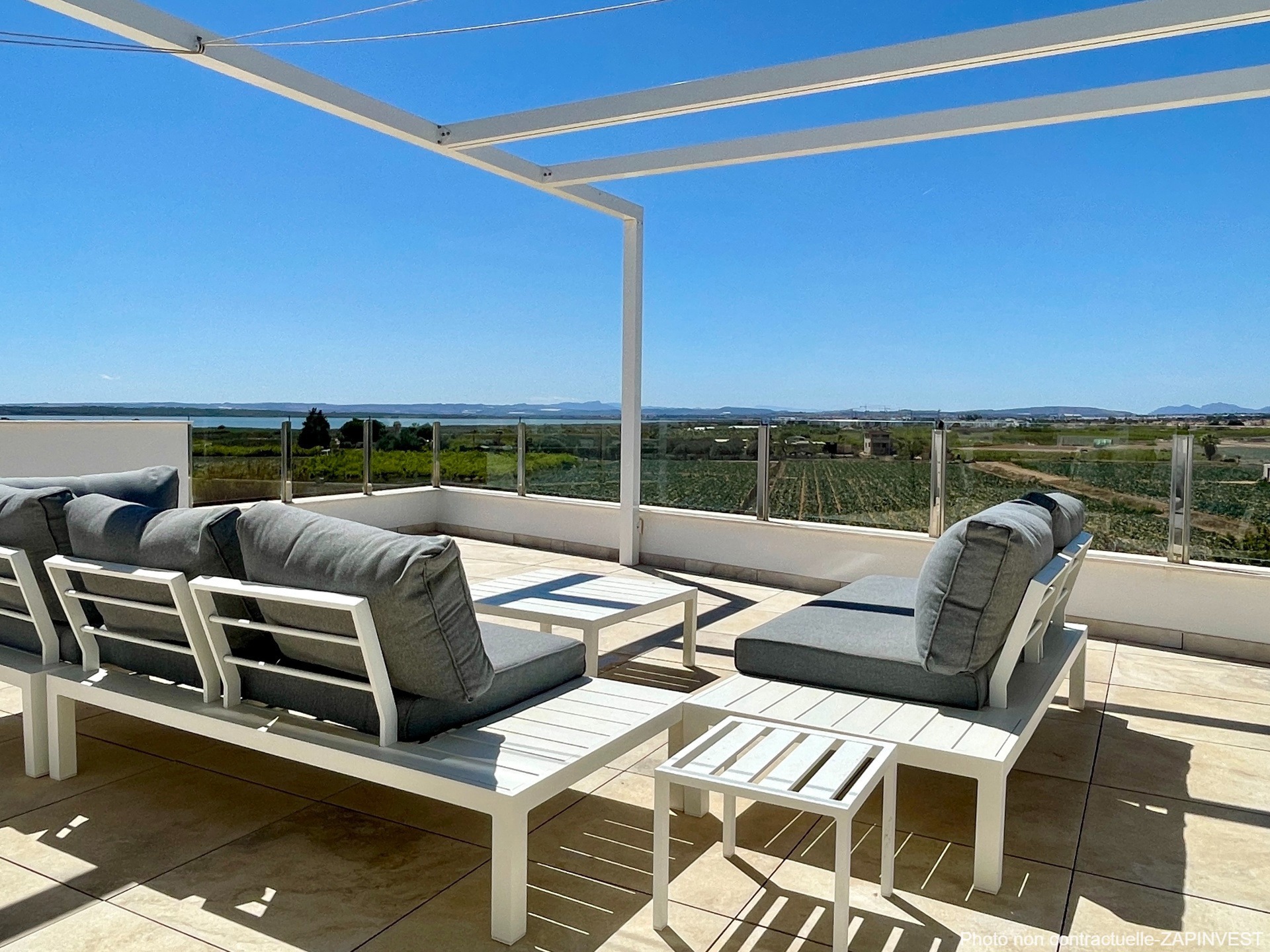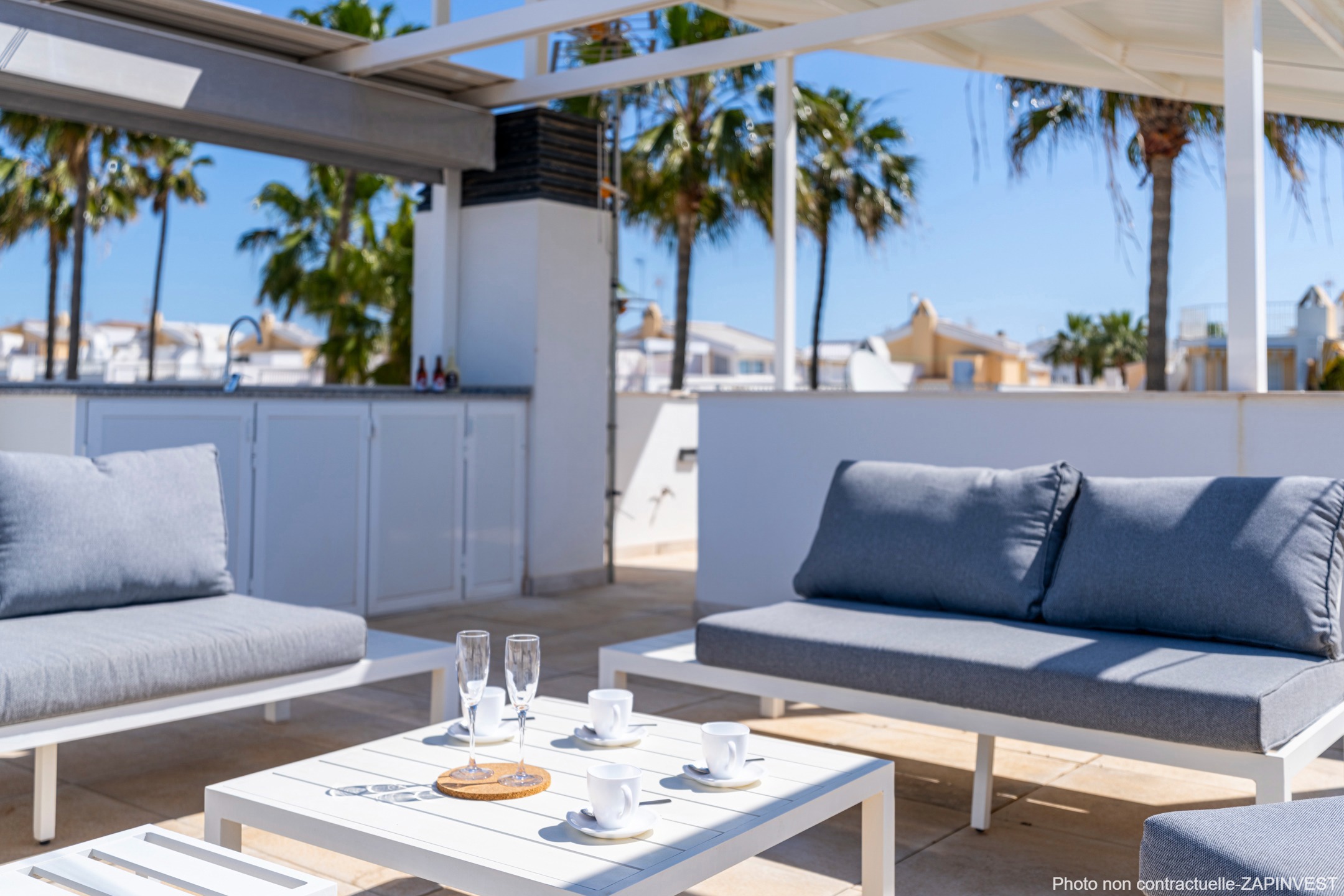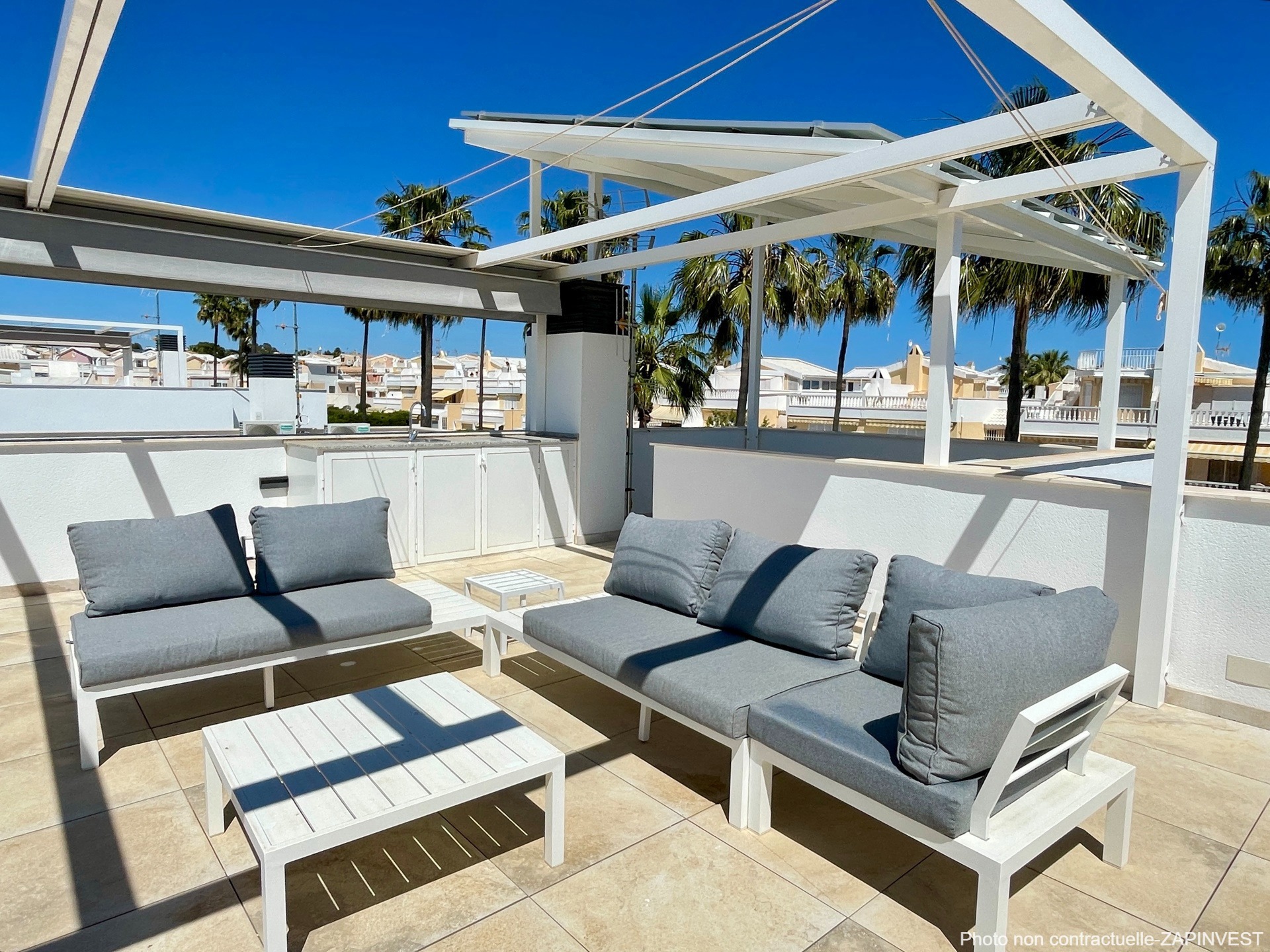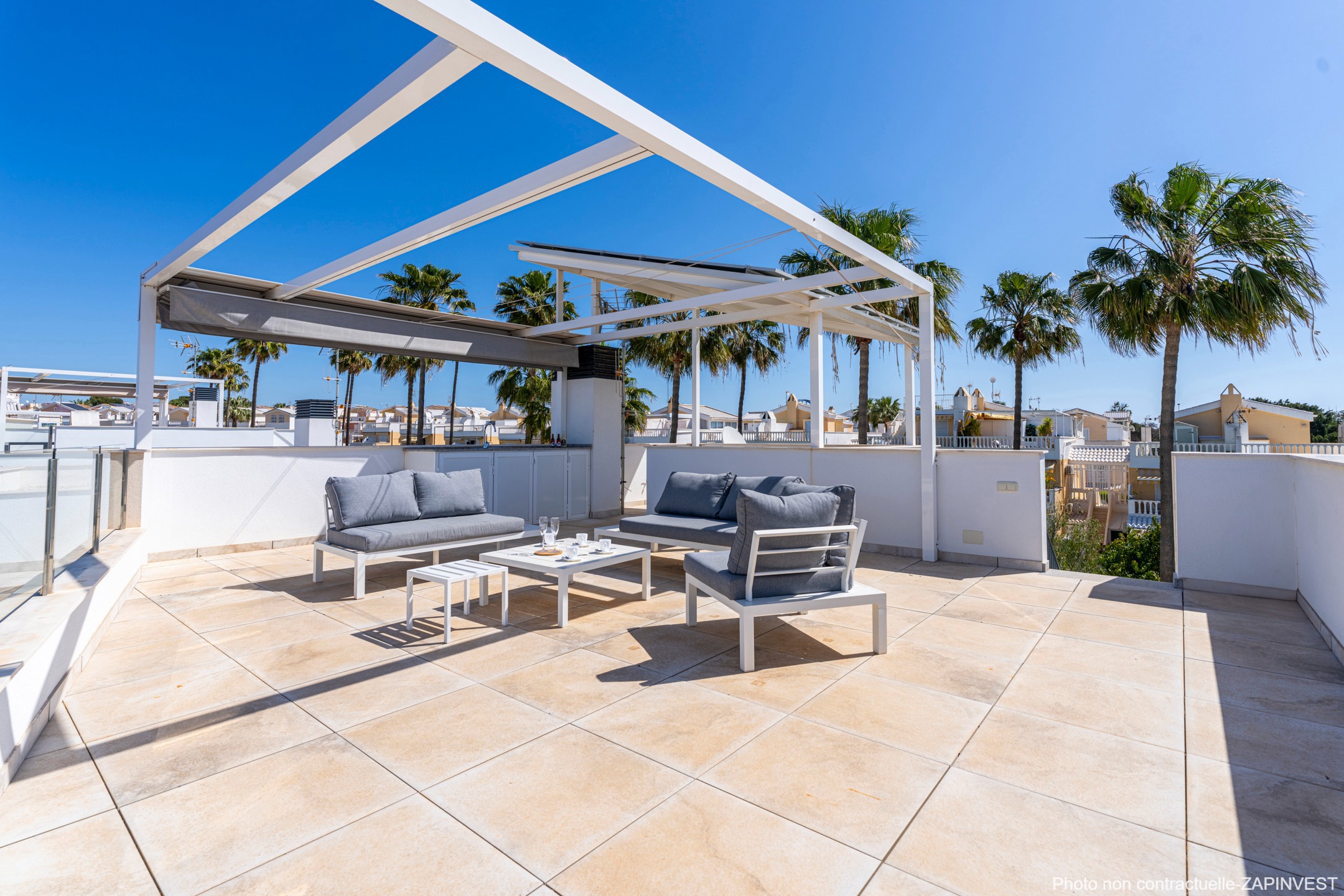 Le solarium est équipé d’une cuisine d’été avec deux pergolas : L’une d’elle est rétractable et la deuxième, avec panneaux solaires réduisant considérablement la consommation d’électricité de la maison.