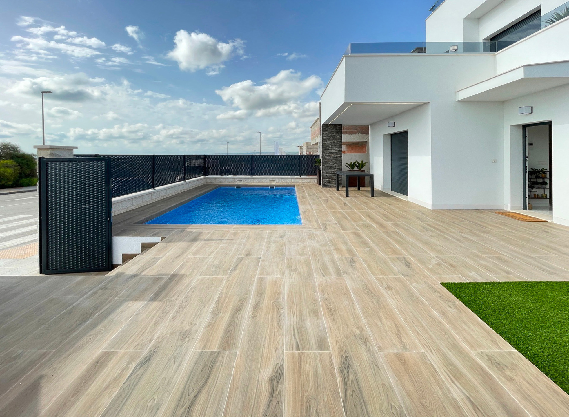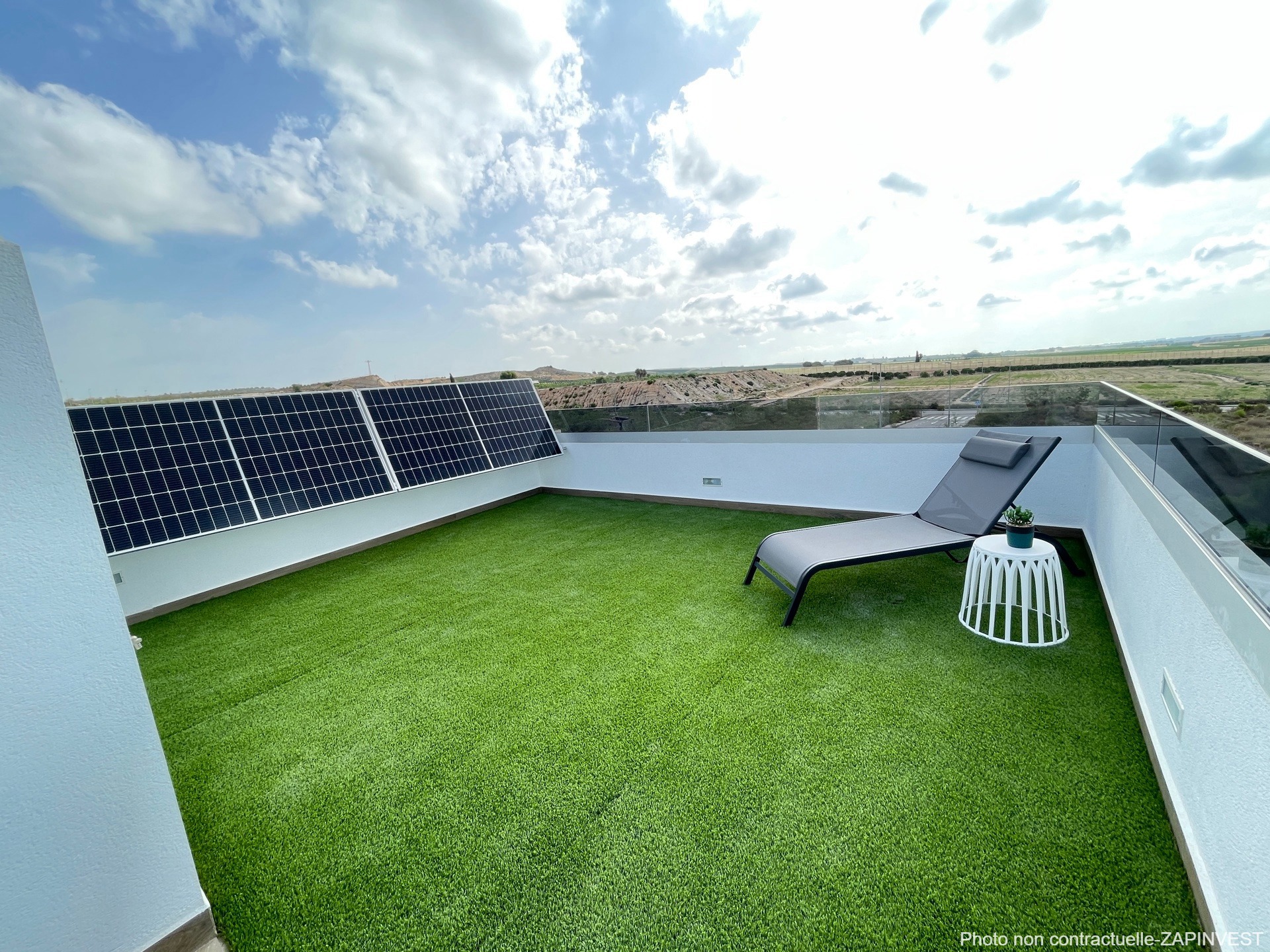 La chambre de l'étage, dispose d'une très belle terrasse supplémentaire. Un solarium (terrasse sur le toit) avec gazon artificiel est également disponible en option.