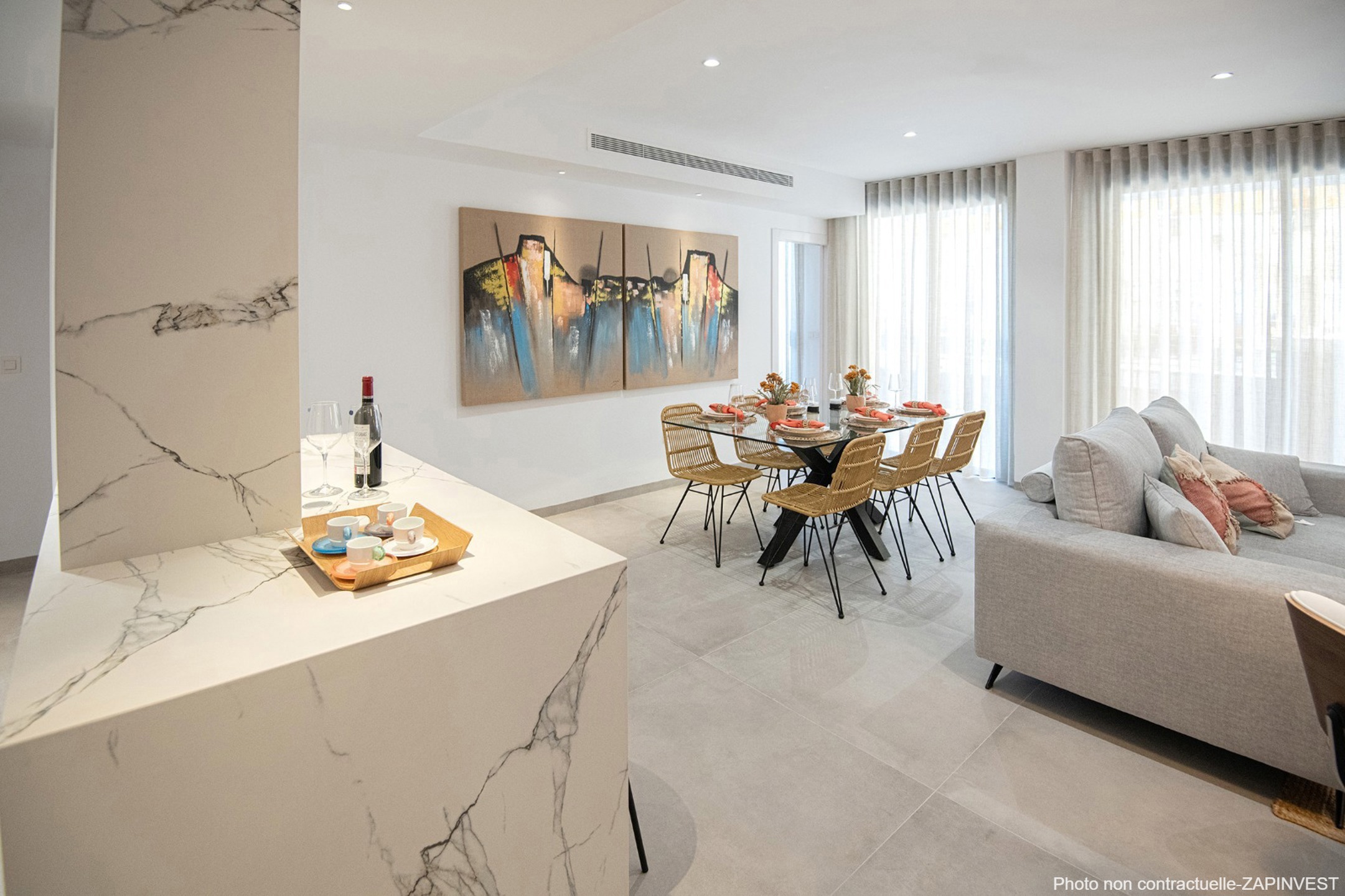 La cuisine est entièrement équipée en électroménagers et donne sur le living très lumineux de par ses grandes fenêtres.