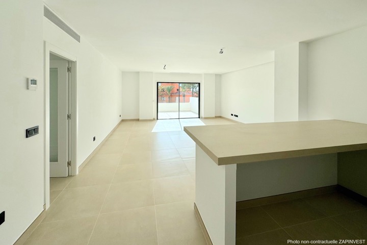 L'entrée de l'appartement se fait directement par la pièce de vie constituée du salon et de la salle à manger qui donne directement sur la terrasse.