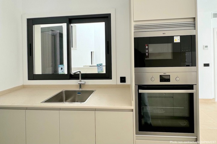 La cuisine est entièrement équipée (appareils électriques AEG de haute qualité) et est attenante à la buanderie qui contient le chauffe-eau de grande capacité et de première technologie éco et est attenante à la buanderie ainsi qu'à un débarras.