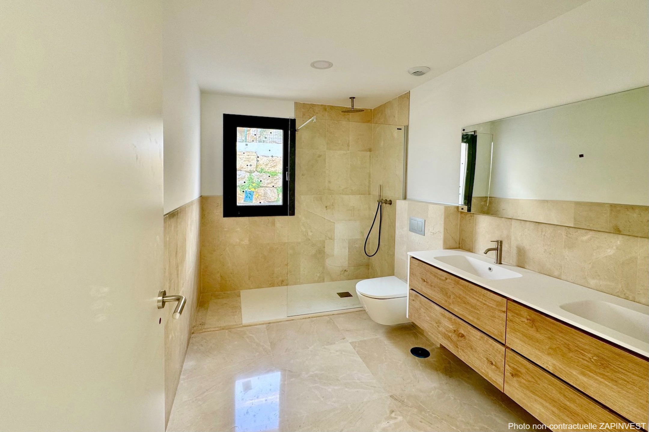 La cuisine est entièrement équipée (appareils électriques AEG de haute qualité) et est attenante à la buanderie qui contient le chauffe-eau de grande capacité et de première technologie éco ; la climatisation est indépendante avec pompe à chaleur Mitsubishi ; double cloison en briques creuses avec isolation thermique, menuiserie extérieure en aluminium avec rupture de pont thermique; des fenêtres coulissantes oscillo-battantes, double vitrage pour une meilleure protection thermique et acoustique, des armoires encastrées avec intérieur en mélamine textile.