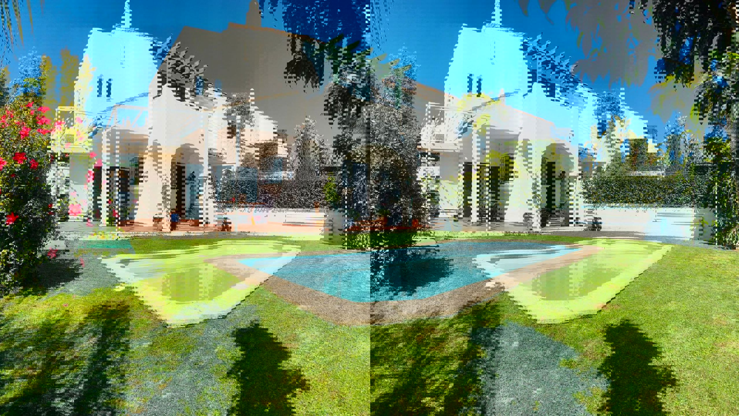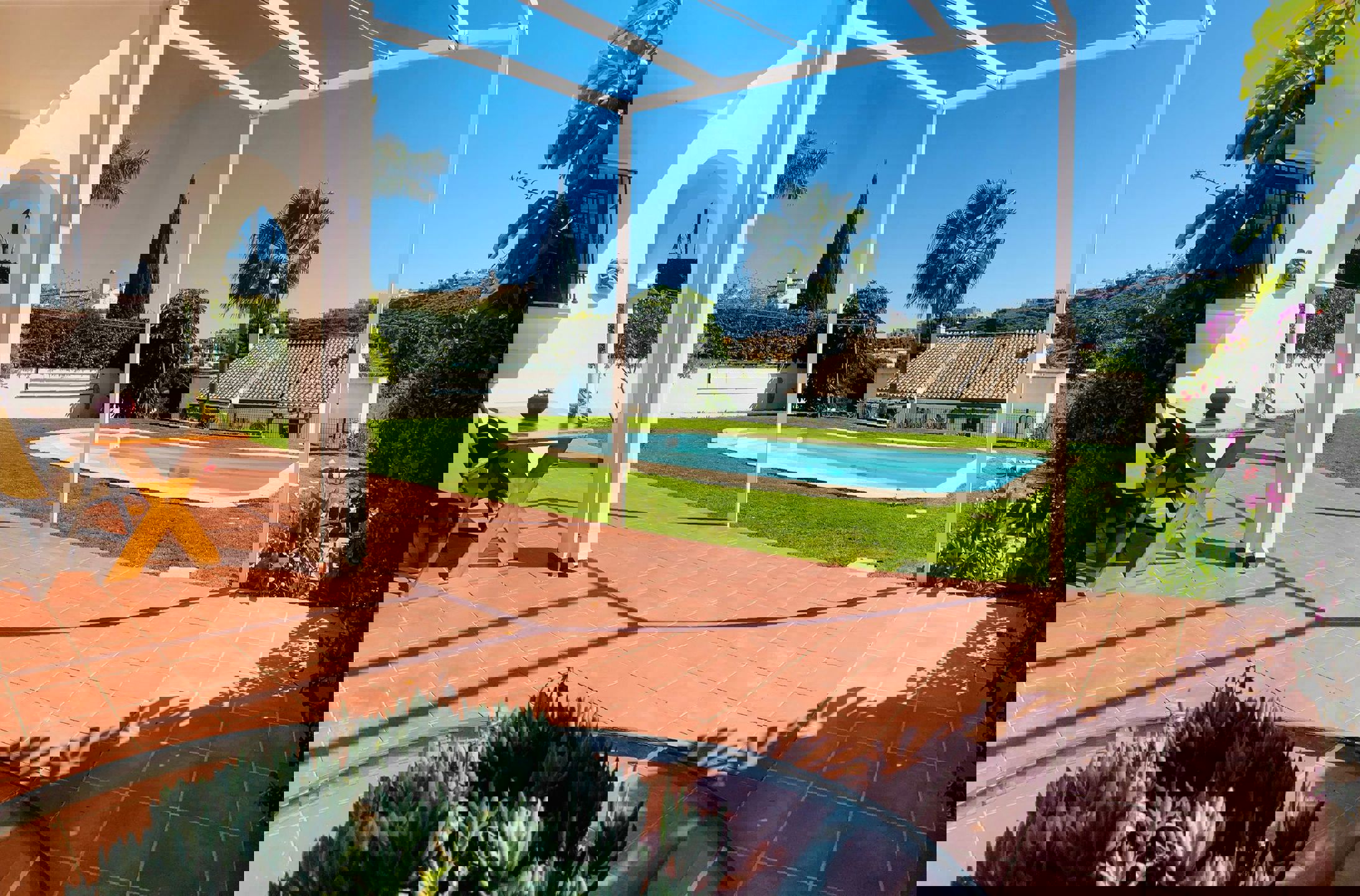 La cuisine est ample, entièrement équipée avec un accès direct à une terrasse extérieure, parfaite pour profiter du repas en plein air pendant l'été, au bord de la piscine. La pièce à l’arrière du salon peut être aménagée comme 4ème chambre, comme salle à manger ou comme bureau.