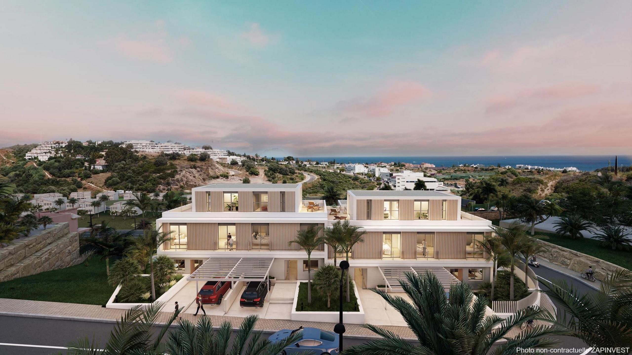 De grandes fenêtres permettent à la lumière de pénétrer dans dans la salle à manger, le salon et la cuisine. Des portes coulissantes en verre donnent accès à la terrasse. Les maisons d'angle disposent d'un jardin privé avec une piscine privée et les autres maisons ont une magnifique terrasse solarium sur le toit avec une piscine privée, idéale pour profiter des vues fantastiques sur la mer. Toutes les villas disposent de 4 chambres, dont une au rez-de-chaussée avec une salle de bains séparée et 2 ou 3 chambres au premier étage avec des salles de bains communes, plus la chambre principale avec une salle de bain attenante magnifiquement aménagée.