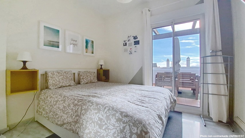 Depuis la terrasse, vous accédez à un vaste solarium (terrasse sur le toit) offrant une vue panoramique sur le golf, les montagnes et la mer. Il est doté de sols en marbre, de volets électriques et d’une climatisation réversible. 2 emplacements de parking en sous-sol sont inclus dans le prix. Il est vendu entièrement meublé.
