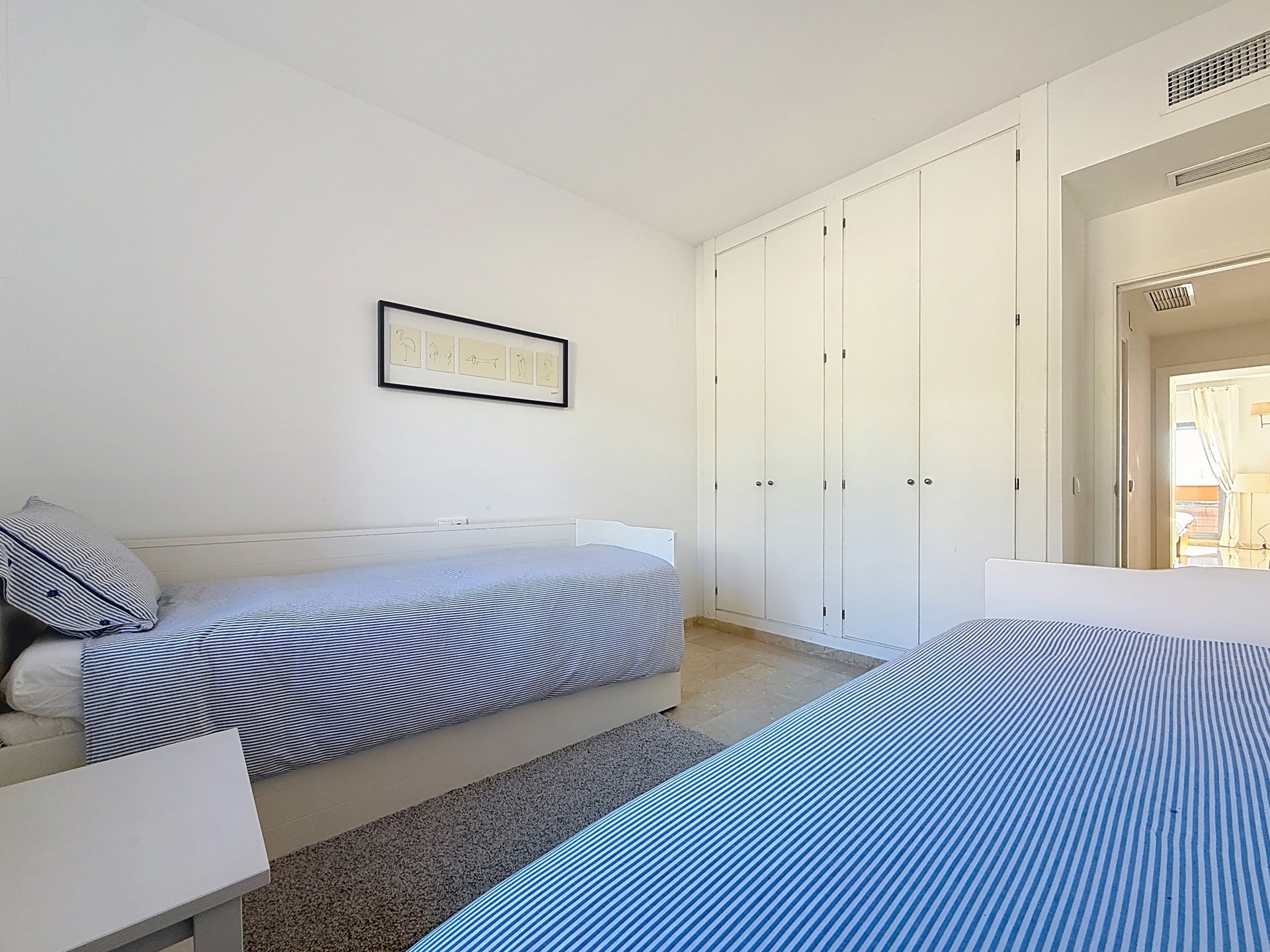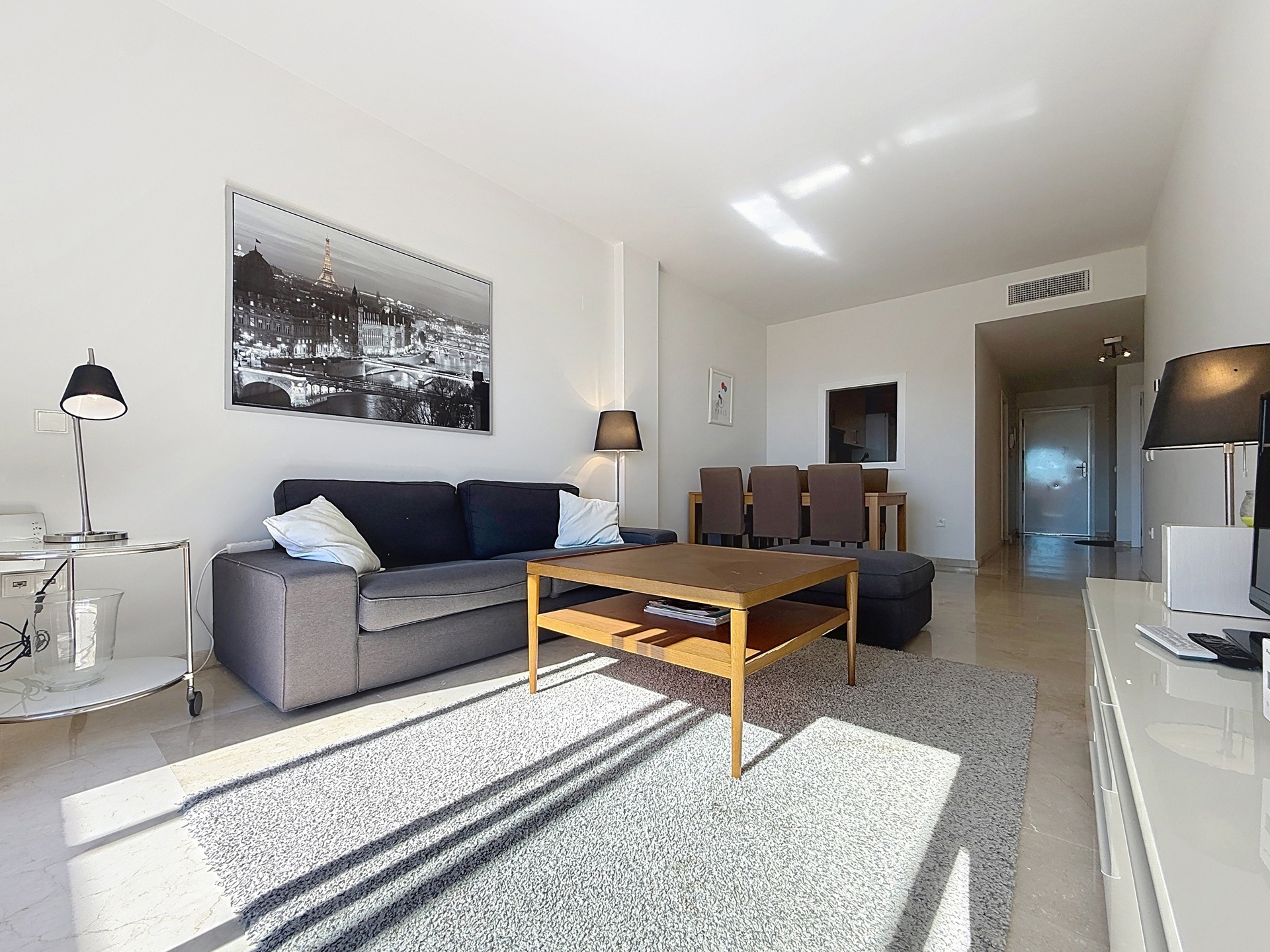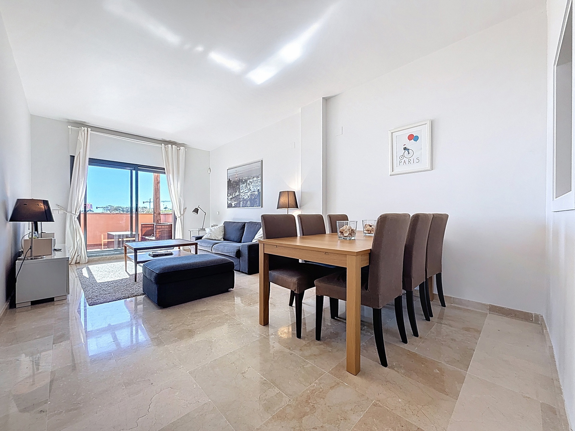 Dès l’entrée, l’appartement propose une distribution fluide : deux grandes chambres et deux salles de bains (dont une en suite), un séjour spacieux et lumineux prolongé par l’extérieur, ainsi qu’une cuisine équipée avec buanderie indépendante. Le bien est vendu entièrement meublé, prêt à être utilisé.