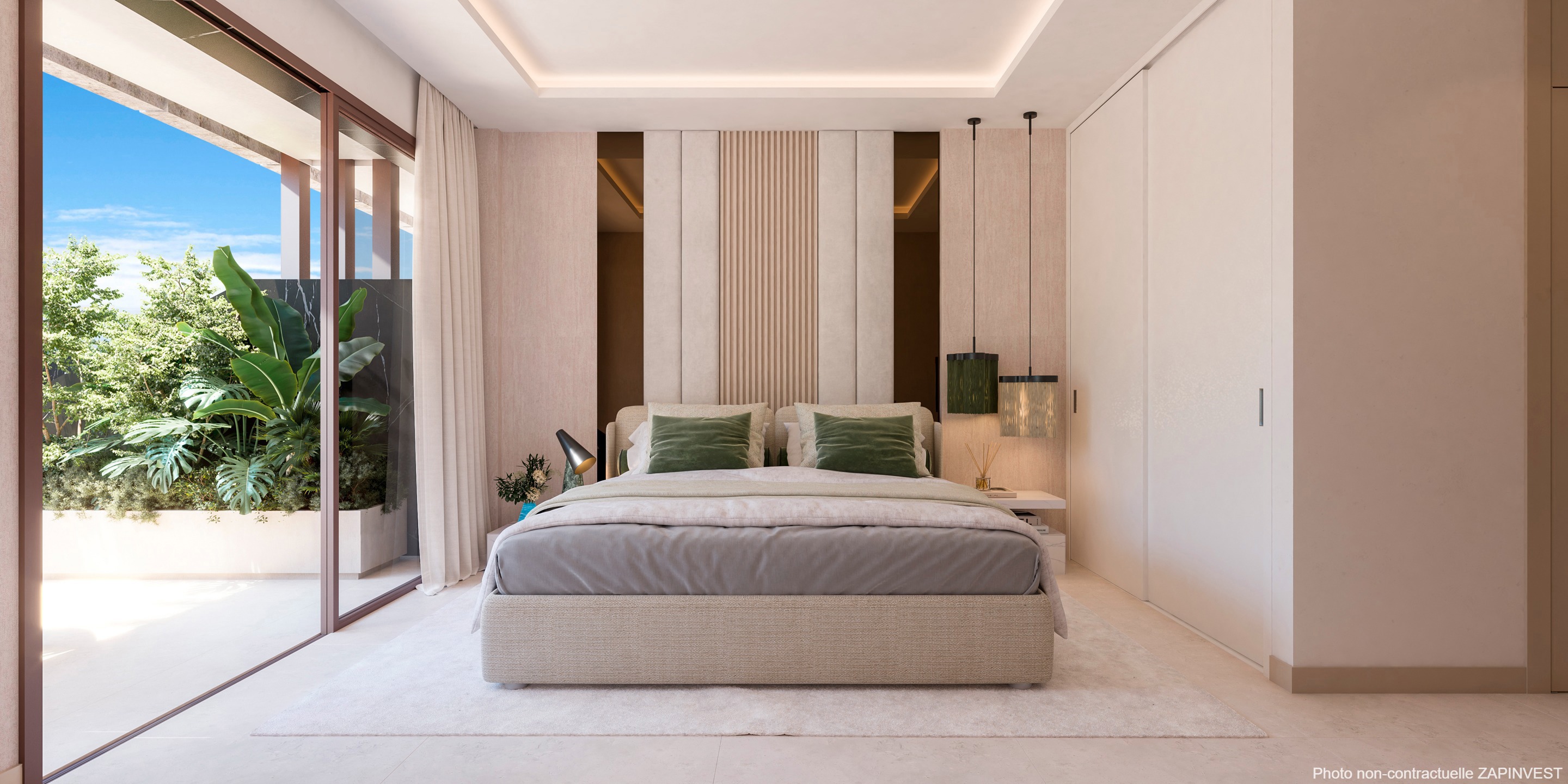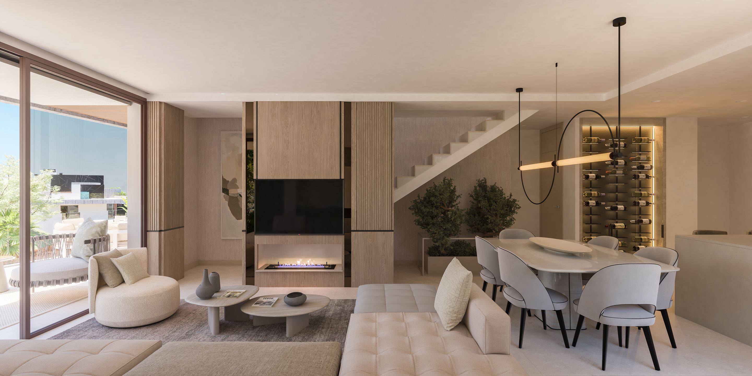 L’entrée de l’appartement donne immédiatement sur le magnifique espace constitué de la cuisine ouverte, de la salle à manger et du salon, le tout donnant sur une magnifique terrasse.