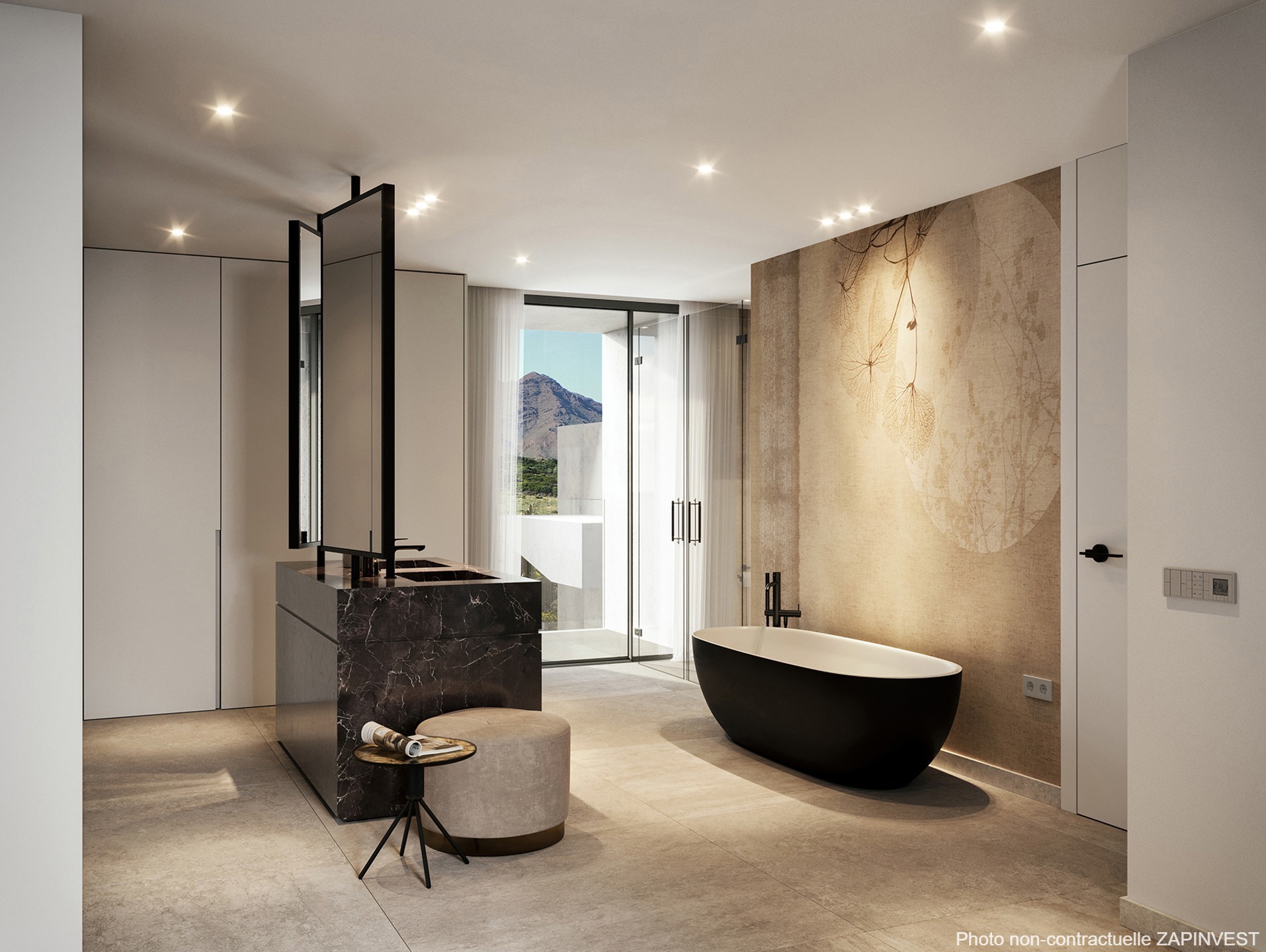 L’entrée se fait par le milieu de l’appartement, directement dans la cuisine ouverte, légèrement décalée par rapport à la salle à manger et le salon, le tout donnant à travers de magnifiques baies vitrées sur la terrasse et de magnifiques vues mer. Composé de 2 chambres à coucher, chacune aux extrémités de l'appartement, l'une à gauche, l'autre à droite avec des salles de bains ensuite. La disposition de l’appartement est assez innovante et originale.
