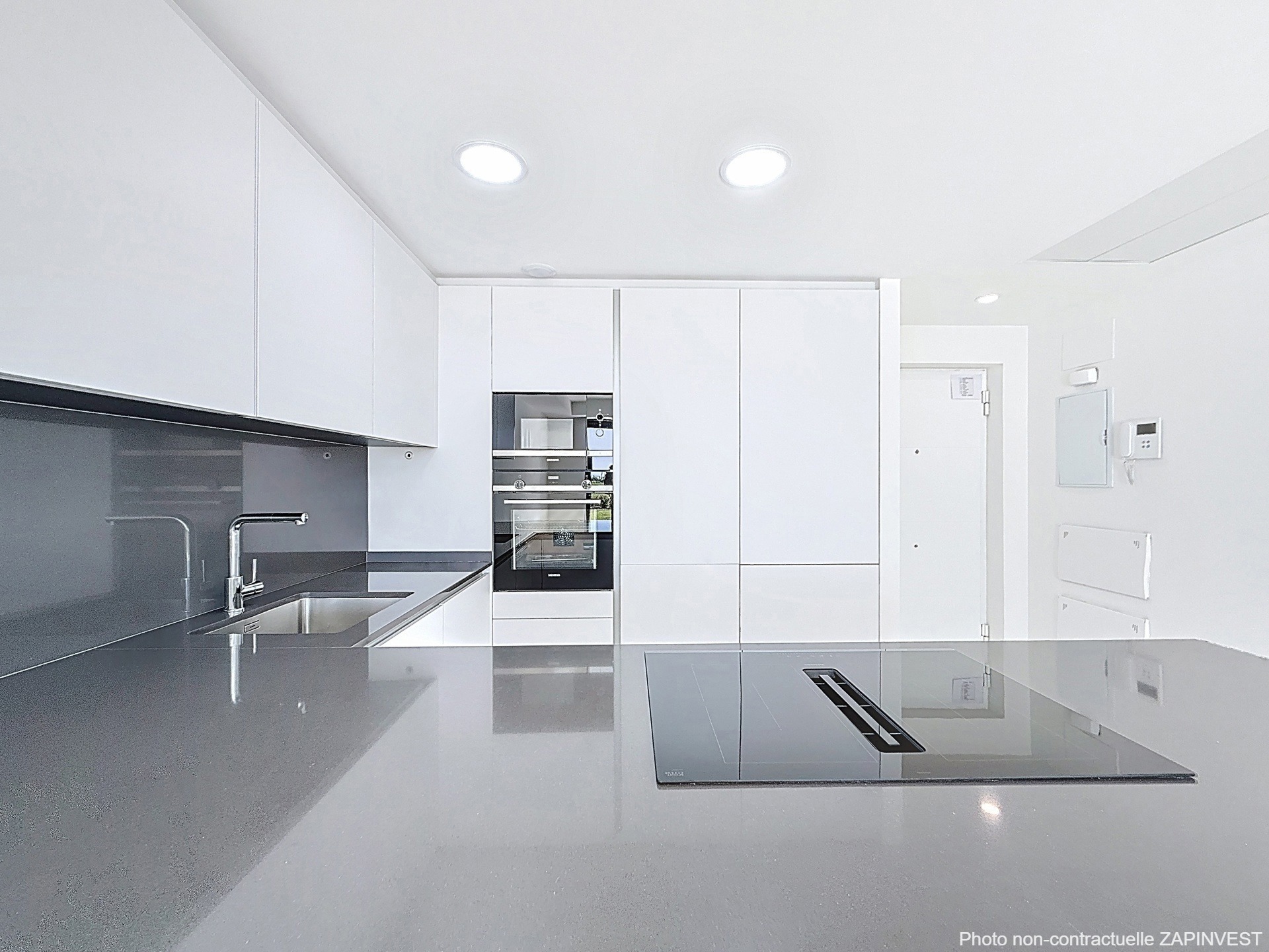 Il comprend une cuisine ouverte avec ilôt central donnant sur la salle à manger et le salon, le tout sur la magnifique terrasse et jardin de plus de 100m2 au total, offrant des vues mer.