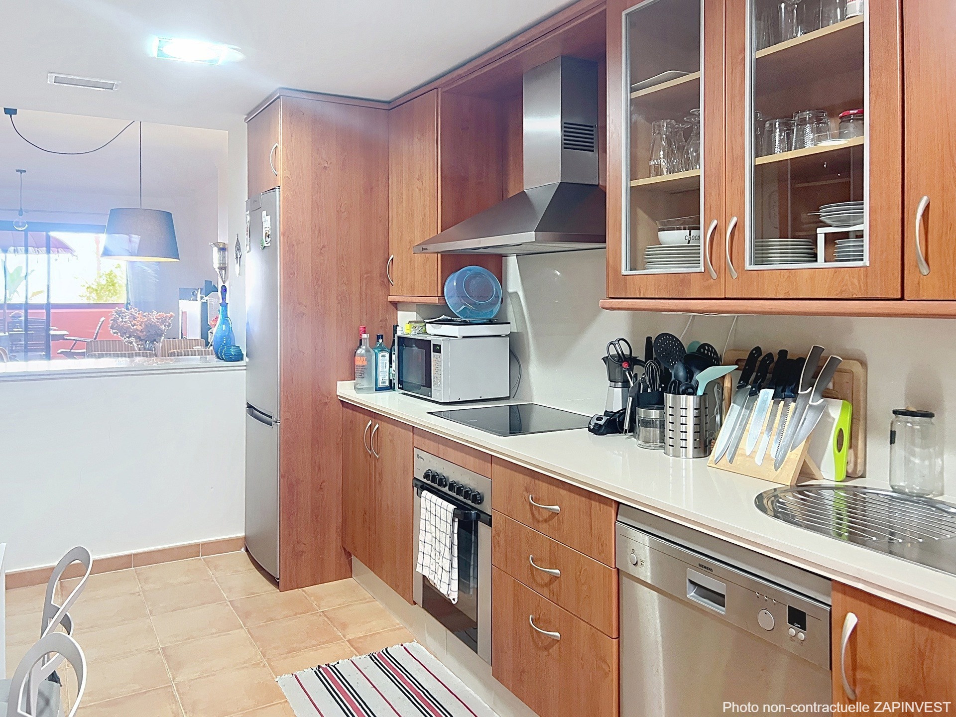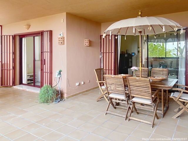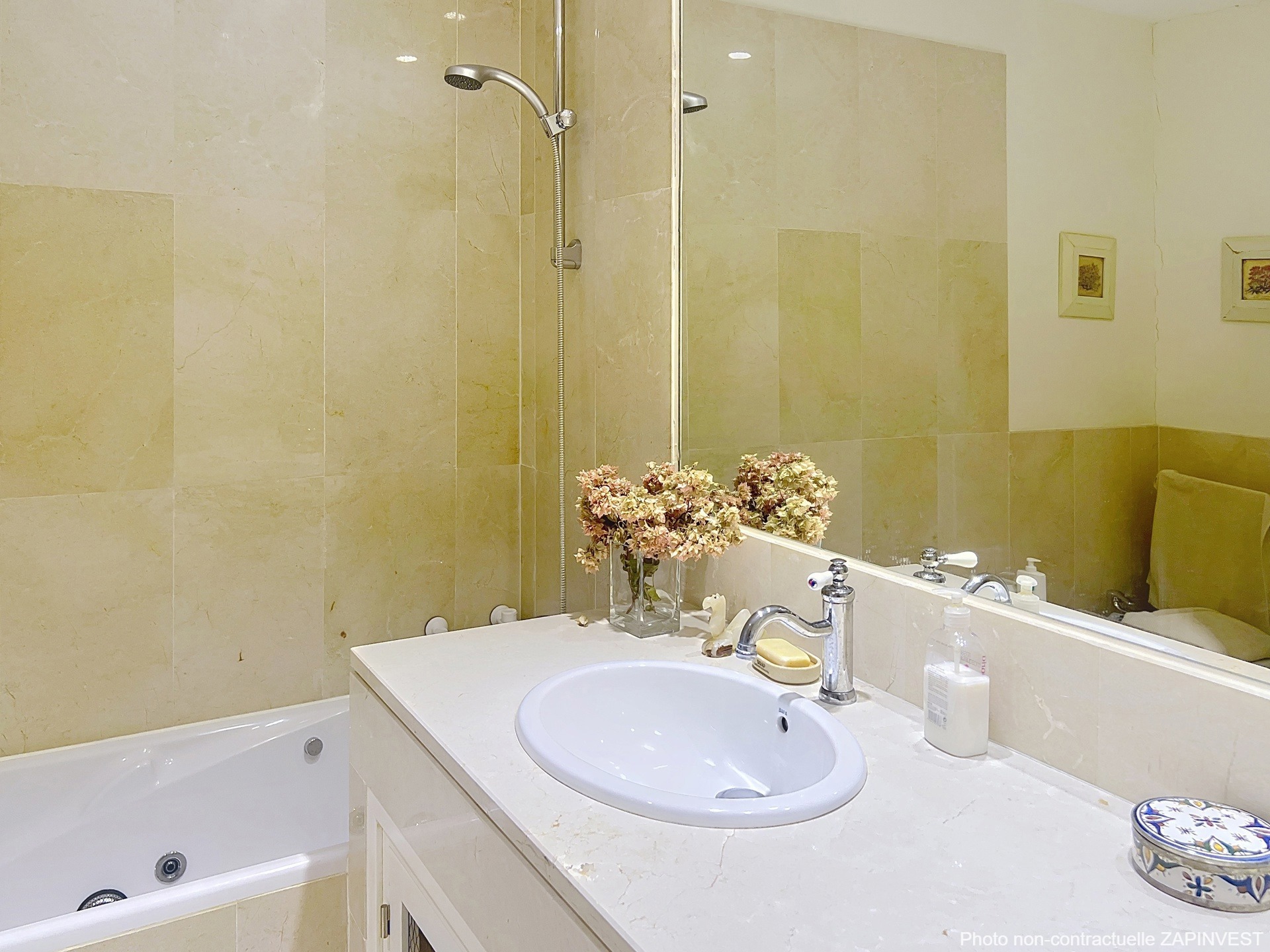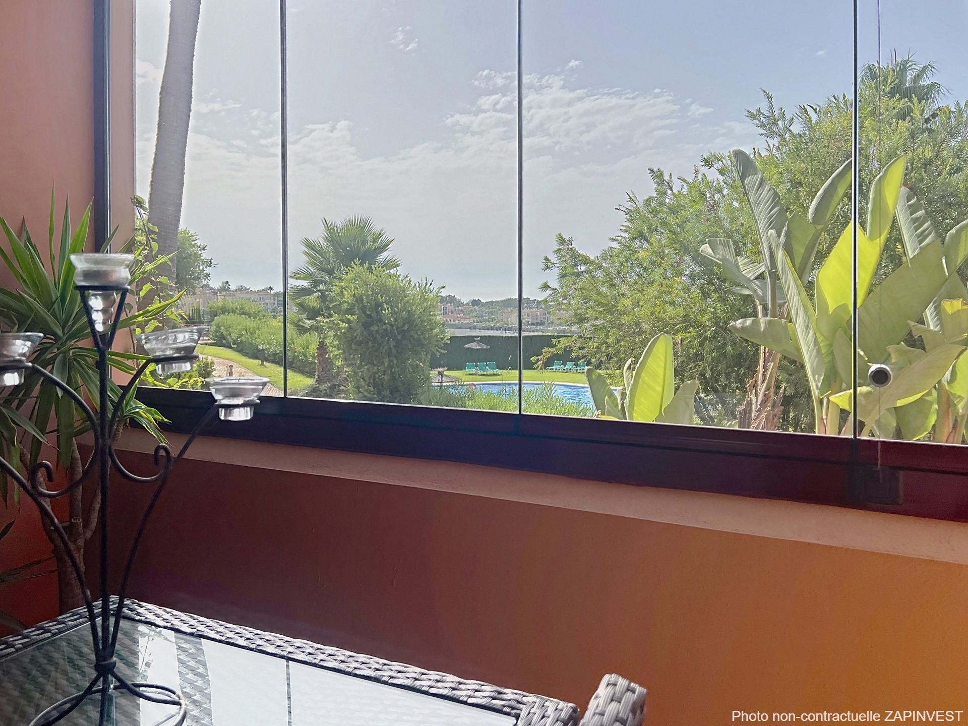 Cet appartement situé au rez-de-chaussée, élevé, offre de grands espaces de vie, 2 chambres et 2 salles de bains en marbre beige de qualité, une cuisine entièrement équipée ouverte sur le salon par un passe-plat.